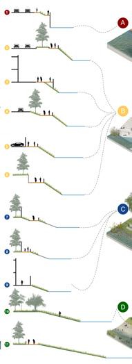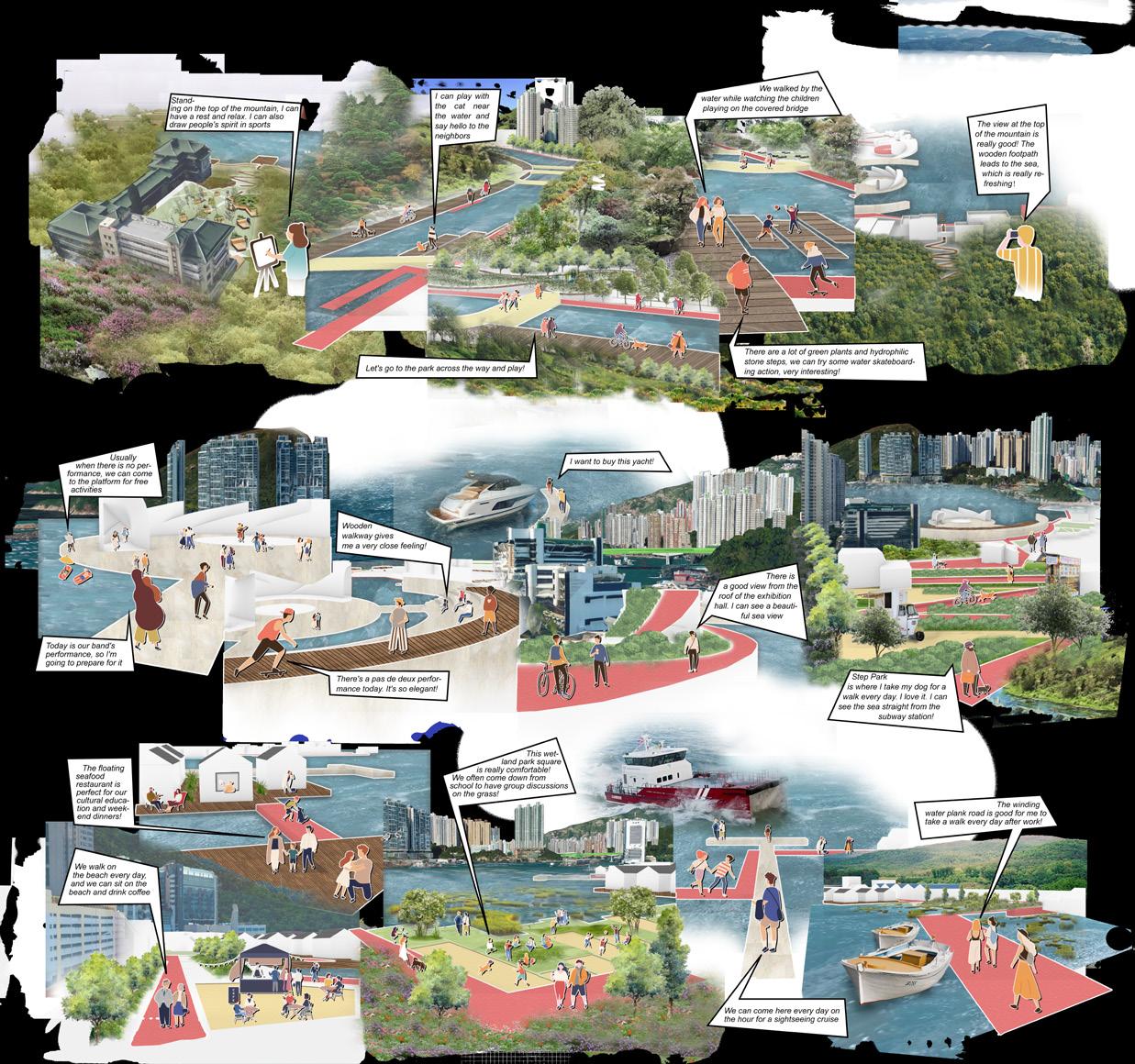 Middle Area connecting the MTR 3. North hill has square on the top POTENTIALS INTEGRATION The northern part of the site has a large waterfront site for traffic; the waterfront trail has a single function, no connection to the opposite shore and no open space on the opposite shore; the accessibility of the church is low and there are no other functions on the top of the hillside The first floor plaza of the swimming pool has low usage rate and no activity equipment; the Marina Yacht Club is a membership system, and the above two buildings block the connection between the waterfront space and the subway station; meanwhile, the green space can only be seen but not used Several schools on the hill are not connected with the waterfront area, the use of hiking trails is poor, the internal environment of the shipyard in the coastal area is poor, the items are placed in a disorderly manner and the space is irregular, dividing the road and the waterfront space. Fisherman Family & Kids Tourists Officers EXISTING MIX PROPORTION PROPOSED MIX PROPORTION 17.6% 24.2% OPENSPACE BUILDING GREENSPACE ROADS 30% 25% 30% 15%