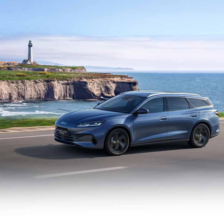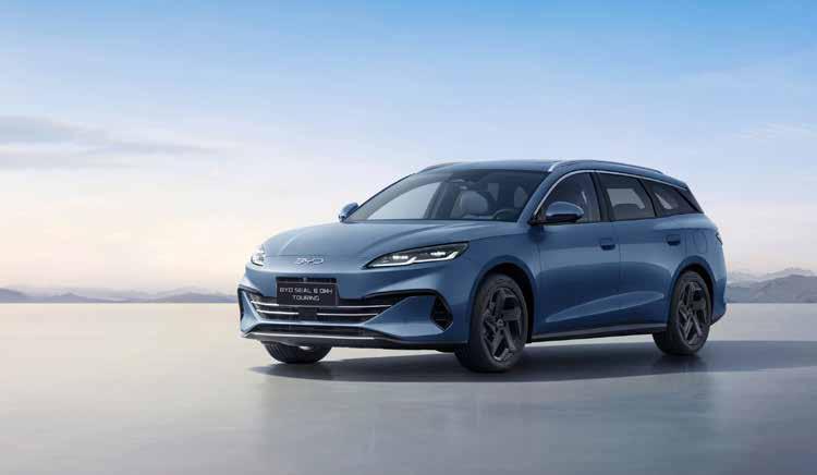 De SEAL 6 DM-i TOURING combineert BYD's kenmerkende designtaal met een praktische, ruime cabine. De voorkant heeft vloeiende, oceaanachtige lijnen en een scherper ondergedeelte dat hem een strakke, moderne uitstraling geeft.