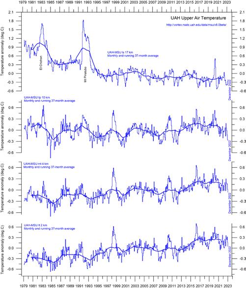 The temperature variations recorded in the lowermost Troposphere are generally reflected at higher altitudes, up to about 10 km altitude, including many individual troughs and peaks, such as the El Niño induced temperature spike of 2015–16 (Figure 13)