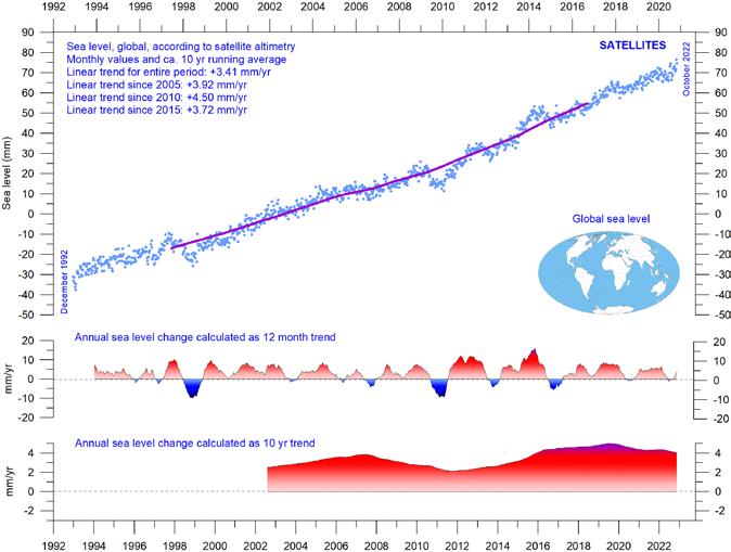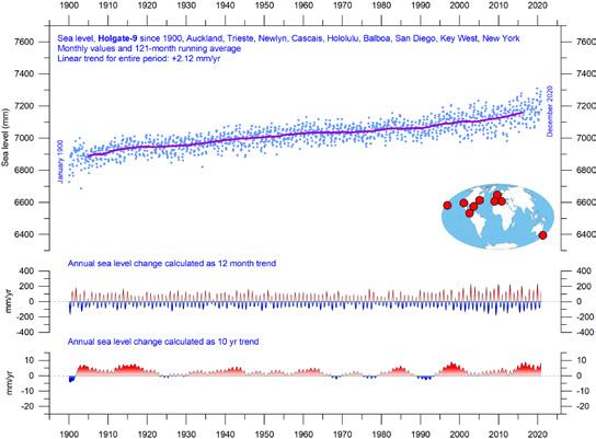 Sea level is monitored by satellite altimetry and by direct measurements using tide gauges situated along coasts. While the satellite-derived record suggests a global sea level rise of about 3.4 mm per year or more, data from tide gauges all over the world suggest a stable average global sea-level rise of 1–2 mm per year. The measurements do not indicate any recent acceleration (or deceleration). The marked difference (a ratio of about 1:2) between the two datasets still has no universally accepted explanation, but it is known that satellite observations of sea level are complicated in areas near the coast (see, e.g., Vignudelli et al. 2019). Either way, for local coastal planning, the tide-gauge data is preferred, as explained later in this report.