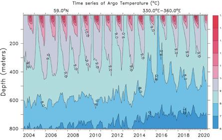The Argo program has now achieved 19 years of global coverage, growing from a relatively sparse array of 1000 profiling floats in 2004, to more than 3900 in December 2021. Since their inception, these have provided a unique ocean temperature dataset for depths down to 1900 m. The data is currently updated to August 2020. Although the oceans are much deeper than 1900 m, and the dataset is still relatively short, interesting features are now emerging from these observations.