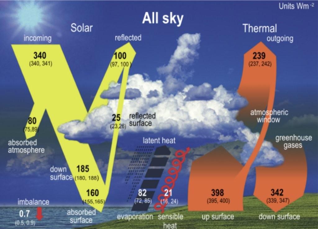 It is useful to start with a simplified depiction of the solar energy flow that reaches the Earth, its transformation by the Earth’s climate system and the resulting (mostly thermal) energy flow that leaves the Earth’s atmosphere. This is shown in Figure 1, taken from a recent IPCC report.