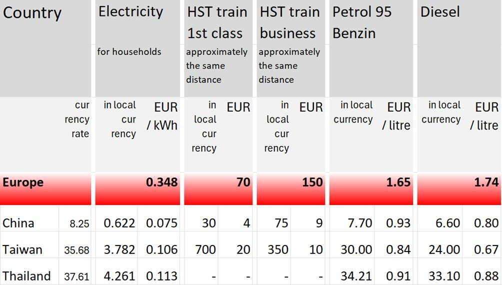 A comparison of the cost of electricity, HST train tickets, petrol and diesel in Europe, China, Taiwan and Thailand: