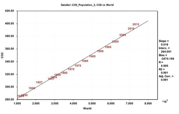 The x-axis gives the world population in millions, and the y-axis shows the corresponding CO2 level in the atmosphere for the period 1800 - 2013.