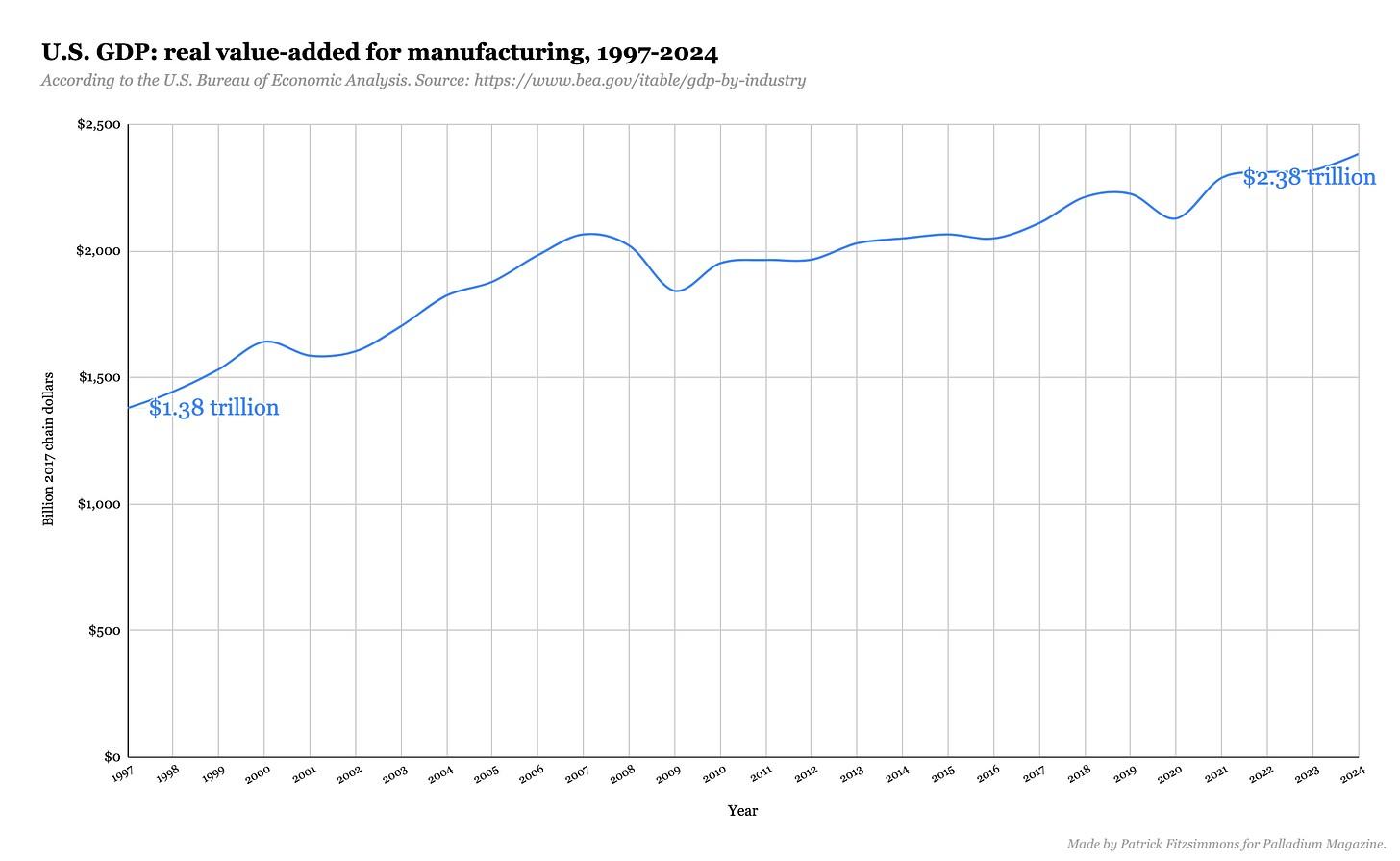 Patrick Fitzsimmons/U.S. real value-added for manufacturing according to the U.S. Bureau of Economic Analysis, 1997-2024