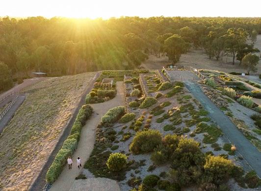 Explore themed gardens showcasing Australian native plants, representing the cultural, environmental, historical, and agricultural aspects of Shepparton and the Goulburn Valley. The garden themes follow a timeline, revealing the story of change as visitors walk along the pathways. The site features native grassy bushland, wetlands, and a 7-hectare, 30-meterhigh reclaimed landfill with a lookout, offering expansive views of the local landscape. This landmark is located on the city’s outskirts, near the Goulburn and Broken Rivers.