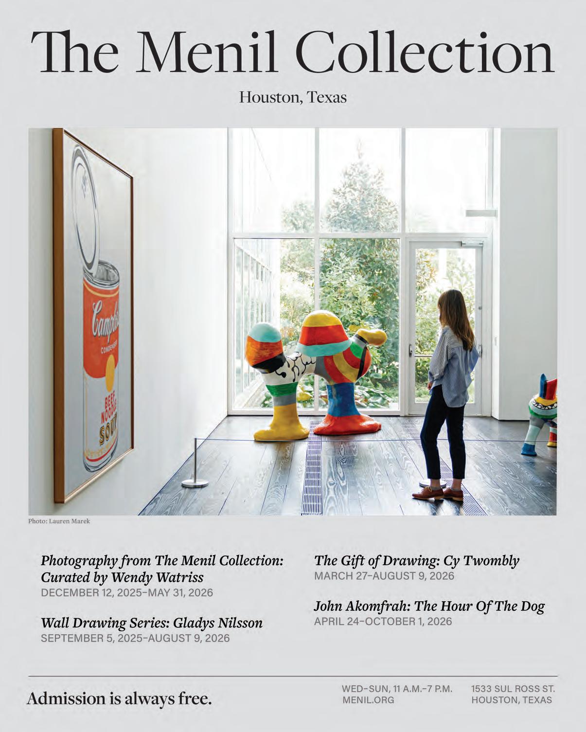 Houston is not a city that announces itself loudly in the arts. On the contrary, its thriving art scene remains one of the country’s best-kept secrets. It reveals itself slowly, through persistence, generosity, and a distinctly Texan belief in making things happen. Artists here develop careers over decades. Our institutions evolve through a sustained commitment to presenting first-class exhibitions. Our community grows through a shared dedication to embracing diversity. This issue reflects that rhythm.