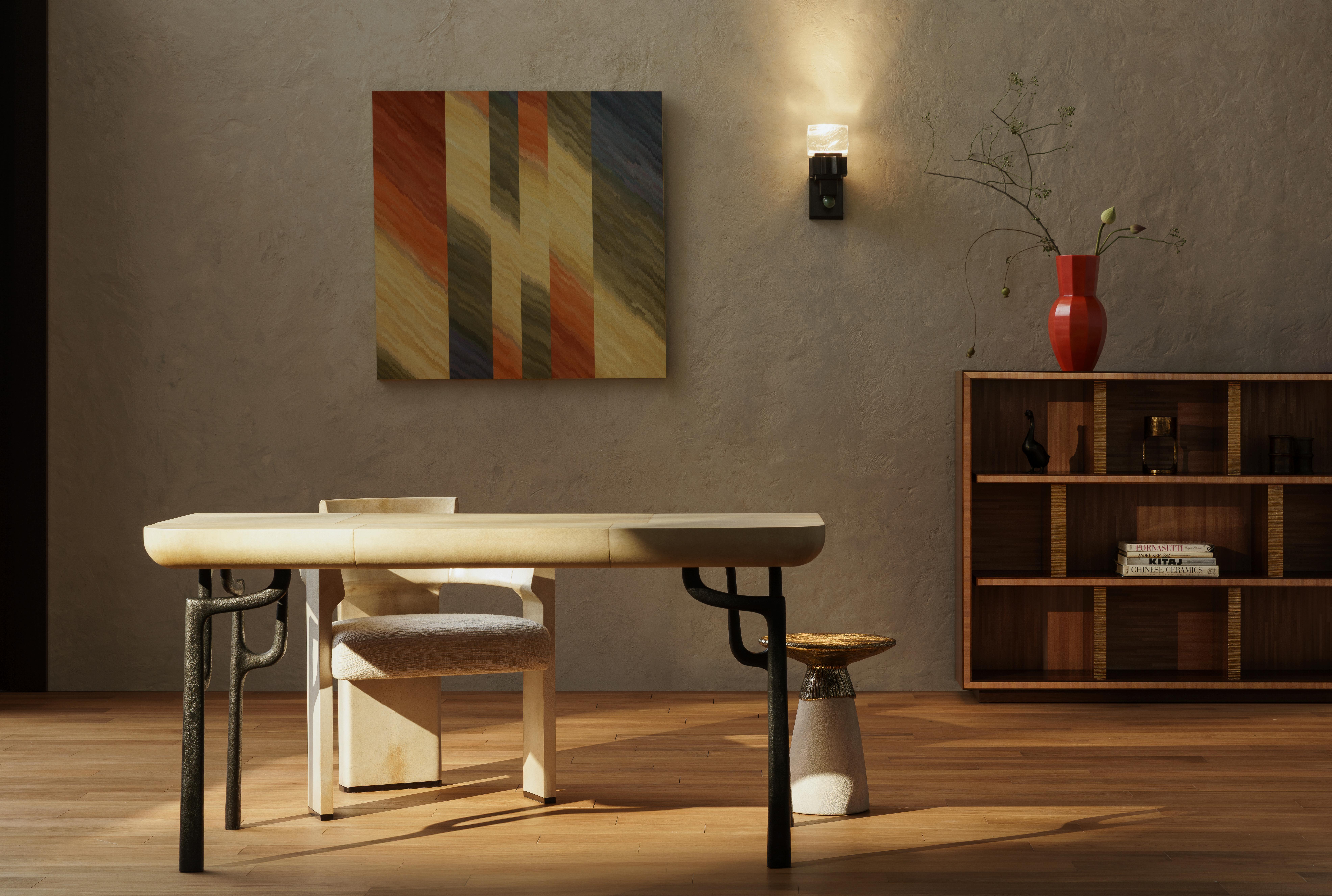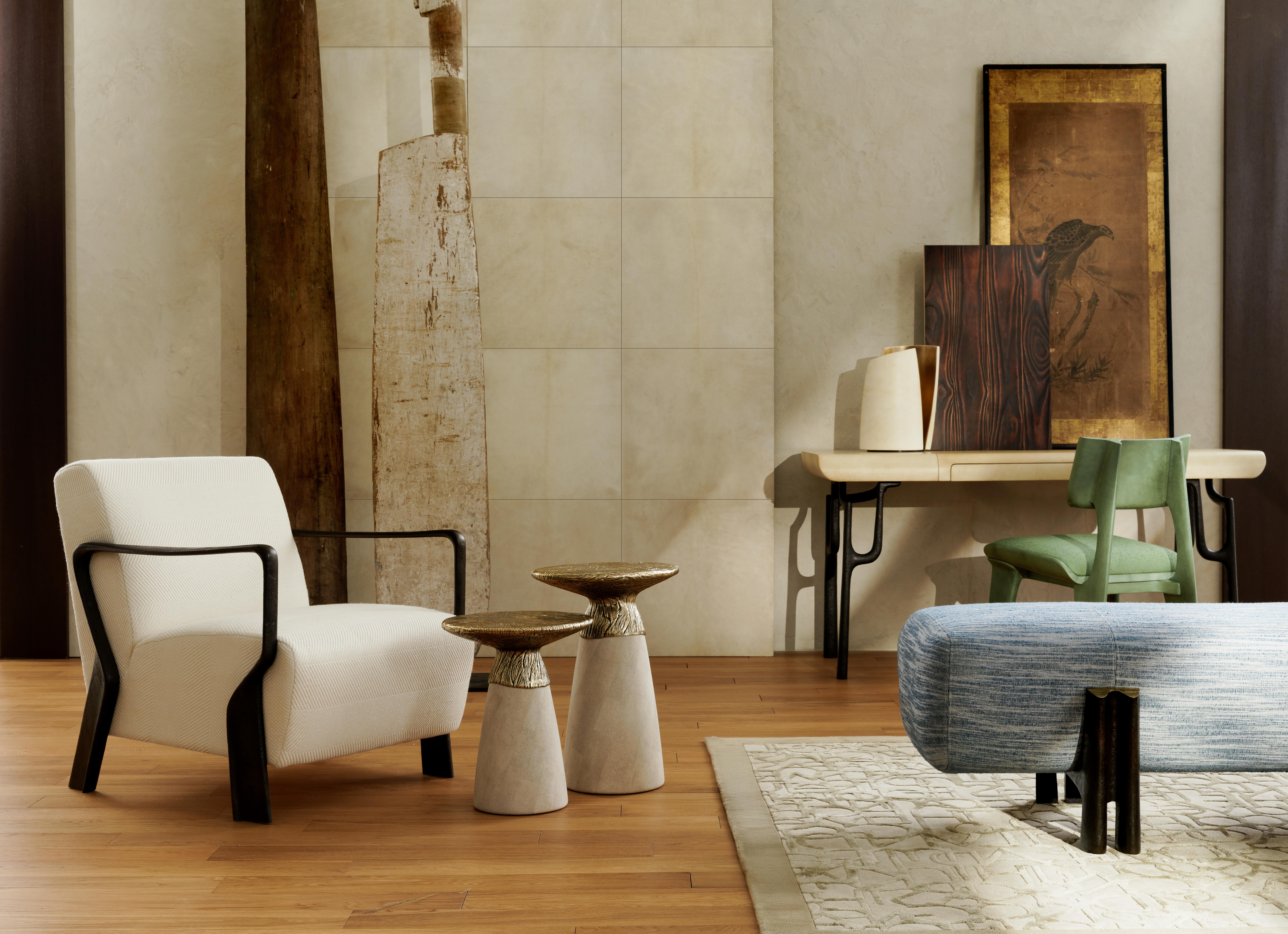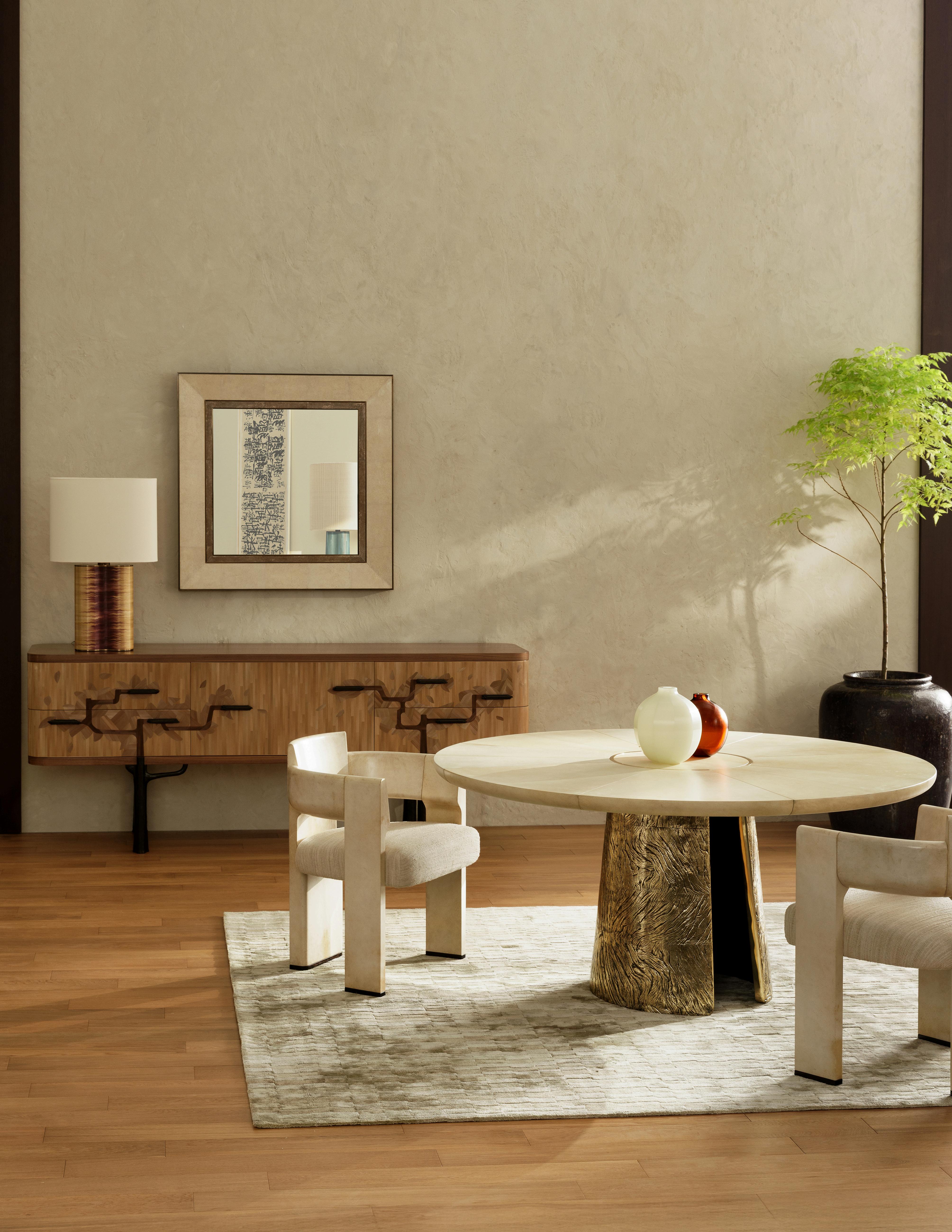 AT ITS CORE, THE PHILOSOPHY IS SIMPLE: ART IS BORN FROM THE MATERIALS THAT CALL TO US SURFACES INVITE TOUCH AND CONTEMPLATION, REFLECTING DECADES OF REFINEMENT ACROSS THESE RARE DECORATIVE ELEMENTS. PARCHMENT, LACQUER, SHAGREEN, AND STRAW MARQUETRY UNFOLD IN NUANCED LAYERS, EACH SURFACE REVEALING SUBTLE SHIFTS IN TONE AND LIGHT. BRONZE ANCHORS THE COLLECTION WITH A SENSE OF PERMANENCE, BALANCING DELICACY WITH WEIGHT.