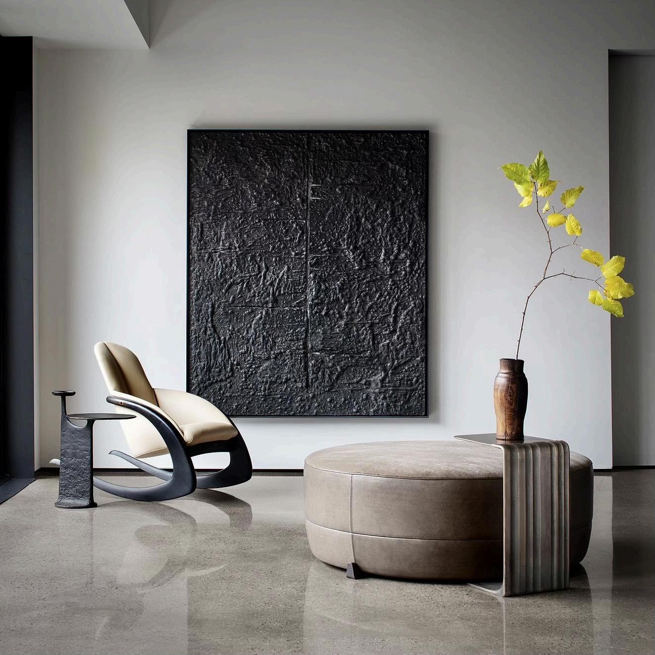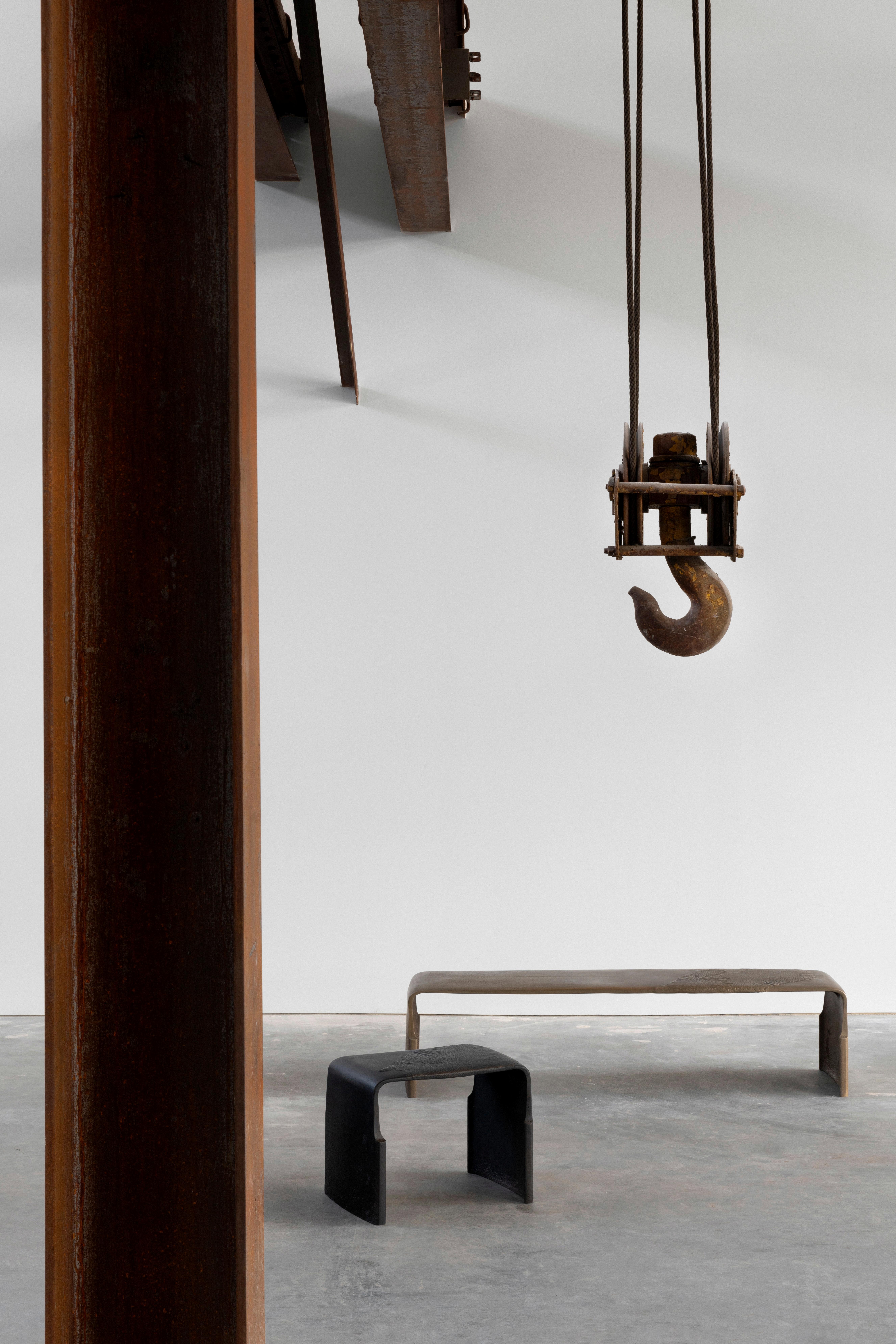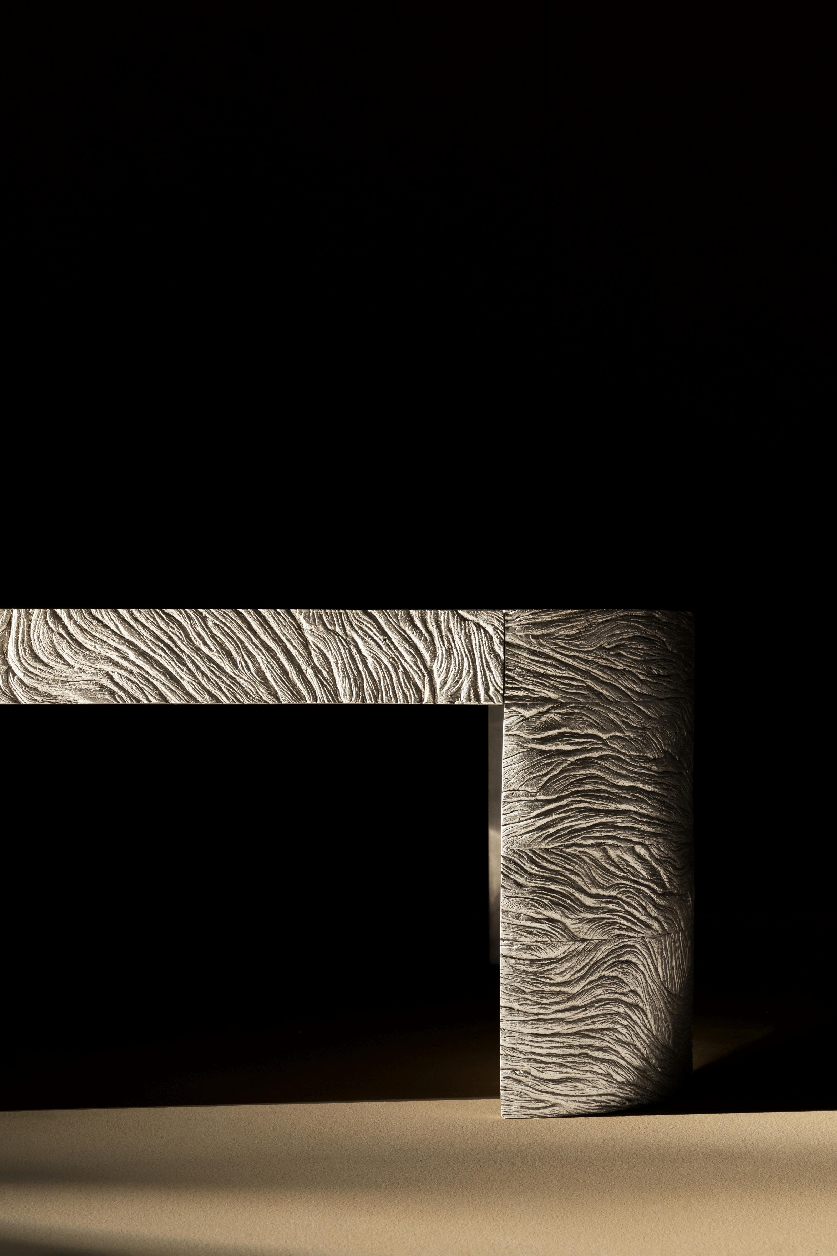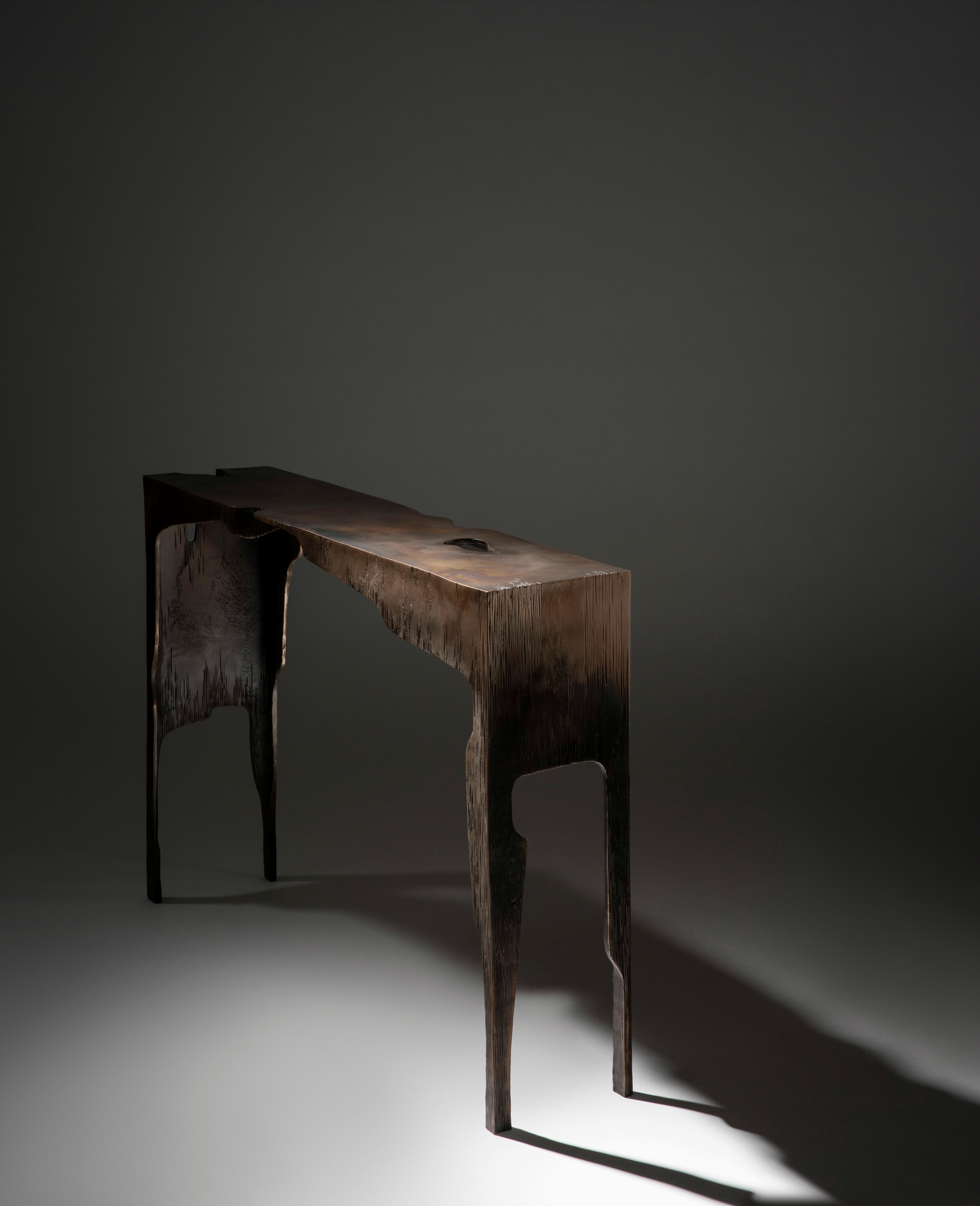 INSPIRED BY THE GEOLOGY AND VAST LANDSCAPES OFTHE AMERICAN FRONTIER, THE WORK IS DEFINED BY WEIGHT, TEXTURE, AND A QUIET IRREGULARITY BRONZE, RESIN, WOOD, AND GLASS ARE TREATED
