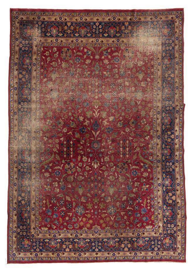 Overall good condition with even pile-wear, soiling, and typical signs of wear commensurate with age and use. Issues include, but not limited to: wear to the selvedge and fringe edges, areas of heavier wear to the pile, several areas of repair, the largest measuring 6” by 6” approximately, patching to the verso, scattered small holes, areas of soiling, and the fringe edges have been cut down.