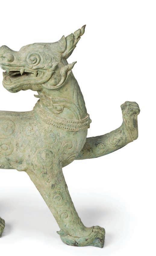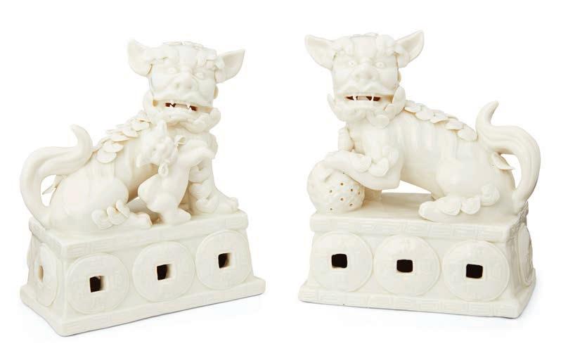 Each overall fair to good condition with shelf wear, scattered minor scuffs, scratches, and inherent firing flaws commensurate with age. Each with multiple cracks and separations at the junctures to the interior and exterior inherent to the production process. One lion with a pinhead-sized spot of oxidation to the glaze on the upper left leg, recto. Possible repair to one lion as it appears to have been re-adhered to the porcelain base with an adhesive.