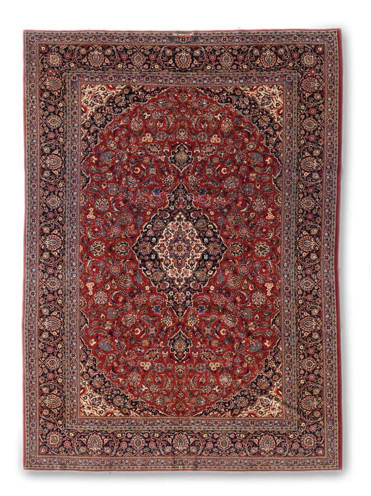The wool and silk on silk foundation rug with a polychrome Tree of Life motif on a scarlet ground