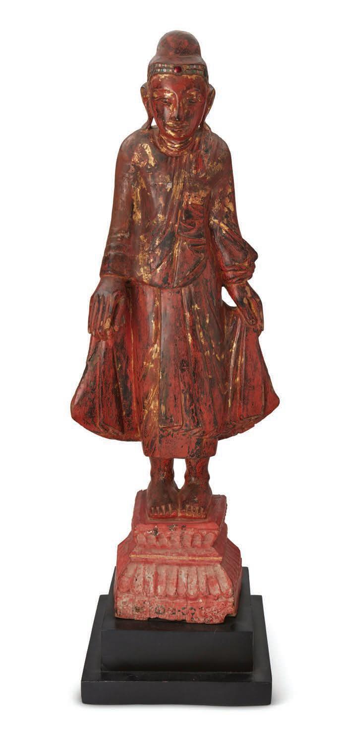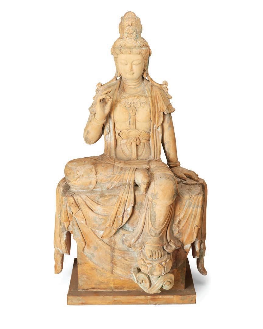 Overall good condition with scattered scuffs, scratches, nicks, shrinkage cracks, indentations, and separation at joints commensurate with age and use. Scattered losses to the pigment and gilding throughout the sculpture. Likely previously mounted and there are losses to the wood pedestal verso.