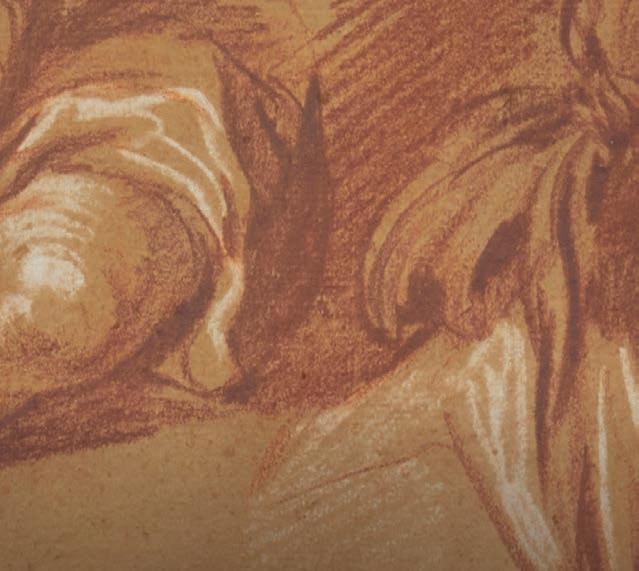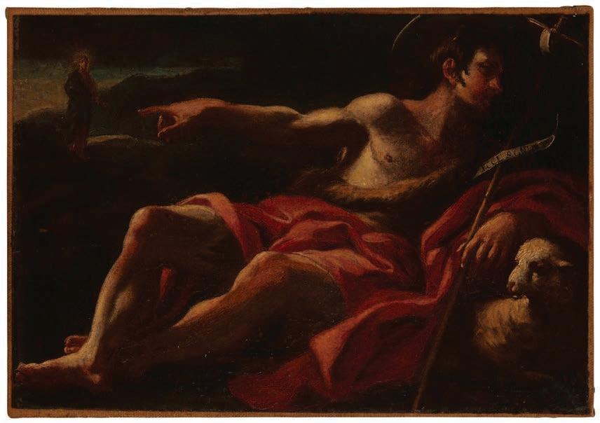 reclining John the Baptist with lamb pointing to Jesus Oil on canvas laid to canvas