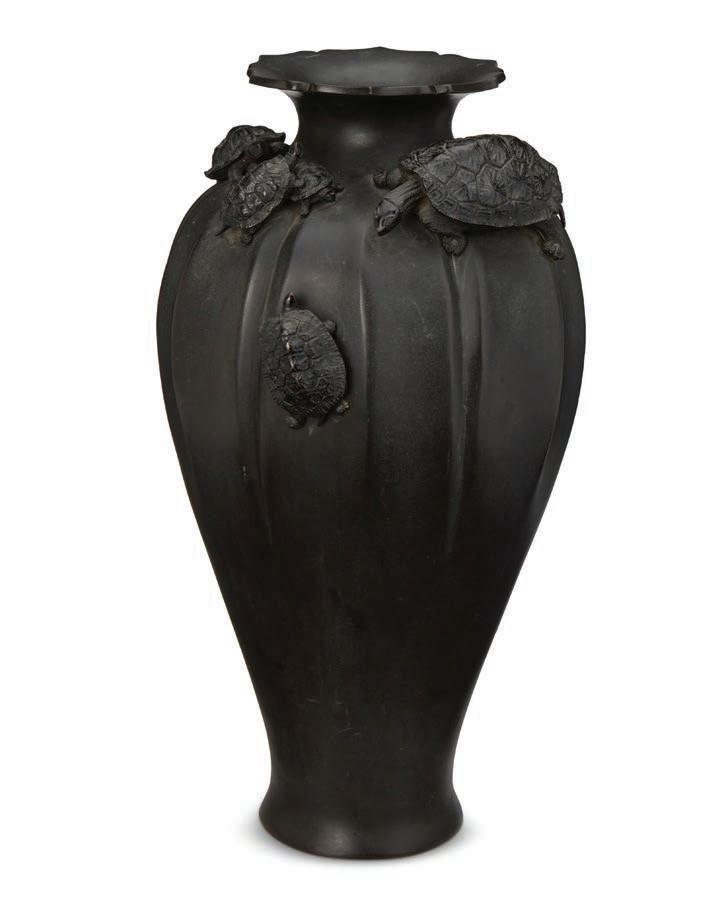 Overall good condition with minor shelf wear, dust accumulation, scuffs, and light scratches commensurate with age. Minor allover rubbed wear to the gilt finish of the bronze. Scattered small cracks to champlevé enamel decorations. Surmounted decorations are slightly shaken and loose. The front glass cover with small chip and possible repair to upper edge. With adhesive tape applied to underside of feet. Lacking back clock cover. Working condition unknown. Moran’s does not guarantee the working condition of clocks and watches.