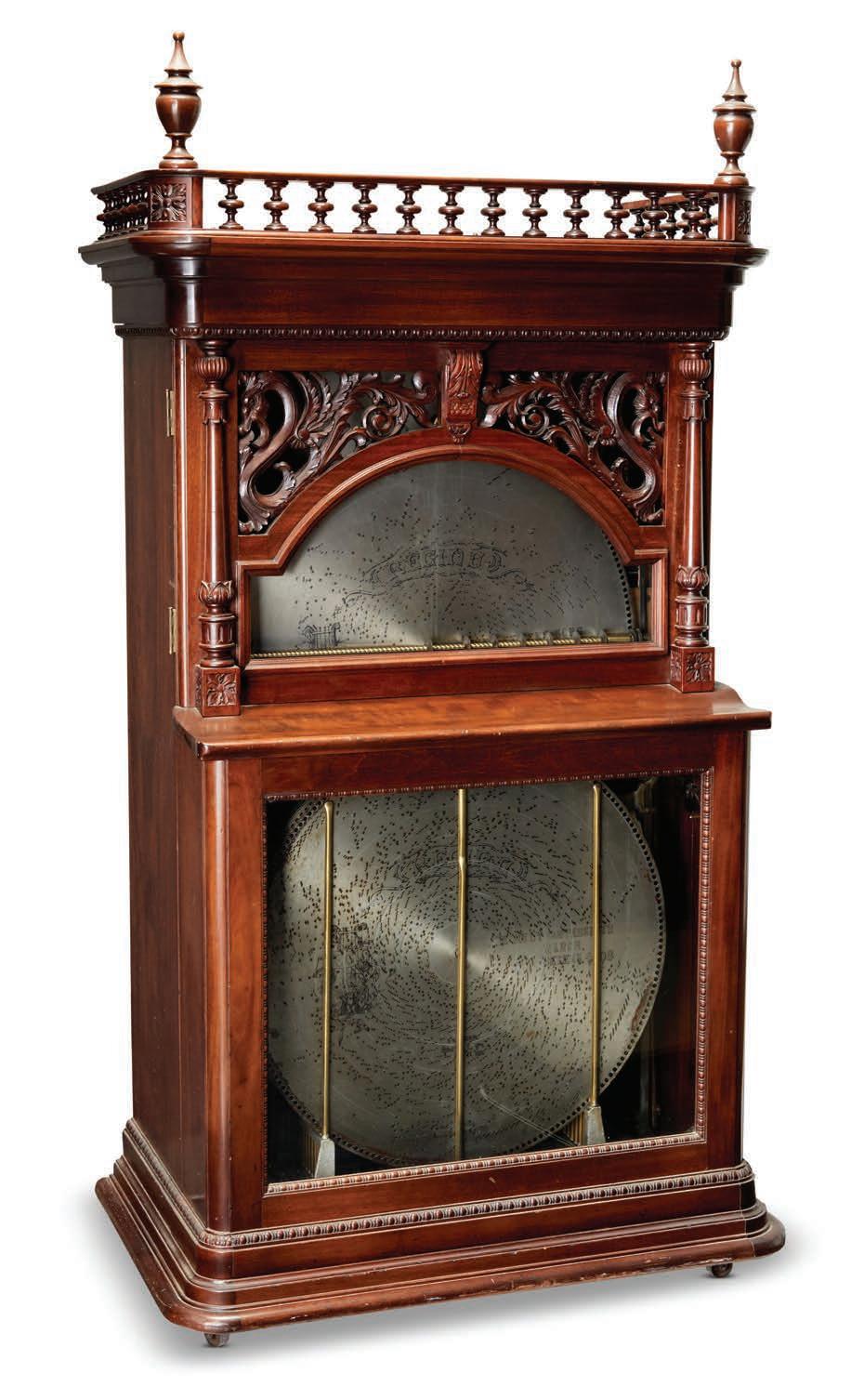 Overall good condition with scattered scuffs, light scratches, and oxidation commensurate with age. The base with scattered scuffs, scratches, and nicks, concentrated at junctures and with a few small chips at edges. The glass case with light scratches, scuffs, dust accumulation, and one 1” area of adhesive residue. Includes key and ball. Working condition unknown. Moran’s does not guarantee the working condition of clocks and watches.