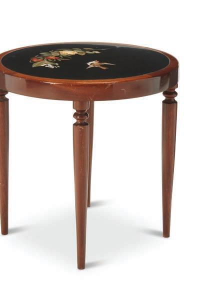 The square-topped table featuring a geometric parquetry border centering a marquetry scene depicting two figures, one smoking a pipe, set on a turned wood and parquetryinlaid post supported on four carved wood and parquetry-inlaid legs