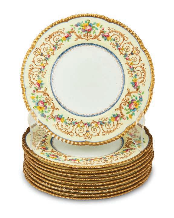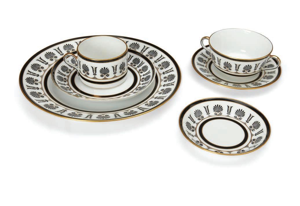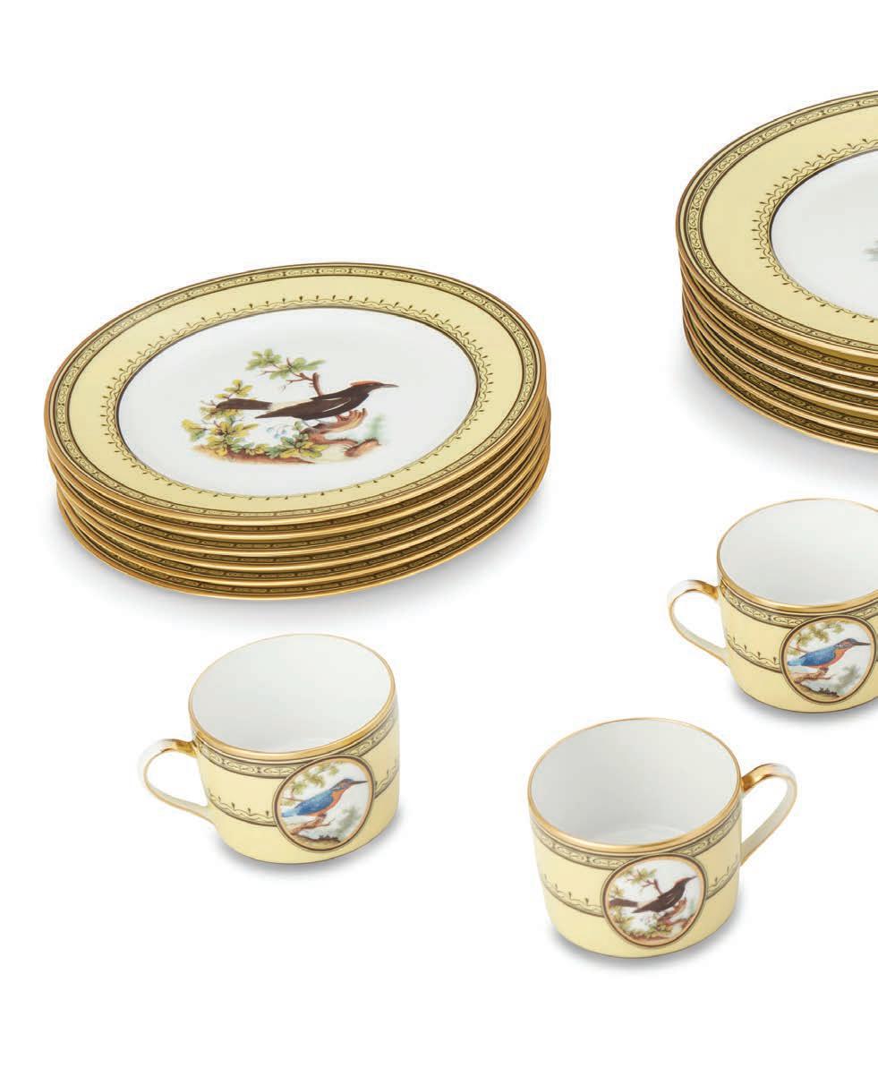 Each overall good condition with shelf wear and scattered minor scuffs commensurate with age. One bread and butter plate with 0.325” x 0.5” chip to edge. One flat cup with pea-sized chip to underside. Some handled items with rubbed wear to the gilt. One gravy boat with minor soiling to the underside of underplate.