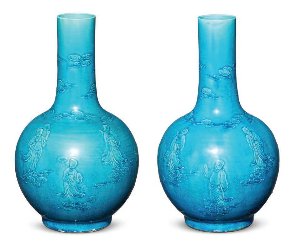 Each overall good condition with shelf wear, scattered minor scuffs, scratches, and inherent firing flaws commensurate with age. One jar with a repair to juncture of the finial and another possible repair to the foot.