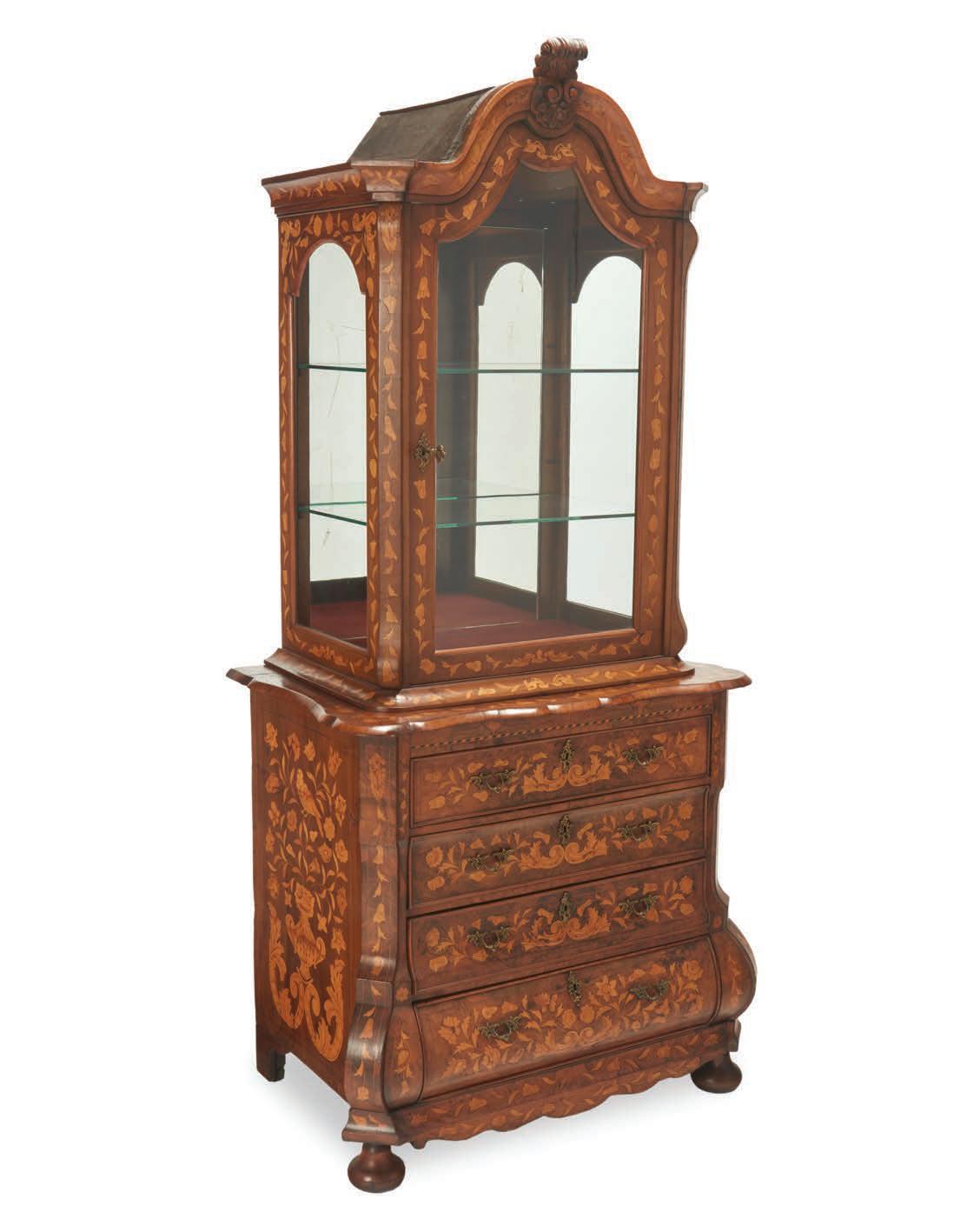 The walnut and satinwood veneered vitrine over marquetry depicting floral and avian tableaus motifs throughout; the vitrine with a single locking to reveal a later-added single light surmounting one lower, velvet-lined shelf, all atop a four-drawer with two cast brass pulls, and set upon four circular 75” H x 32.5” W x 21” D