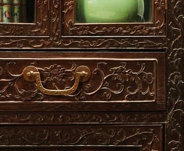 over chest construction with tableaus to each side and repeating floral locking door with glazing, opening surmounting two upper glass shelves and four-drawer chest, each locking drawer circular bun feet, electrified