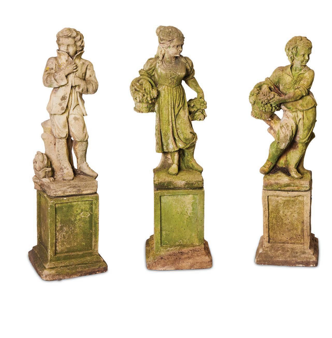 Each overall good condition with minor scuffs and darkening/oxidation to the metal commensurate with age. The gilt paint applied all-over each figure appears to be later added as the original leaf gilding and underlying bole layer are evident on the underside of each figure’s shoes. Similarly, there are losses to the gilt painted surface throughout each figure. As well, there are losses to each figure, primarily concentrated in the area of the feet.