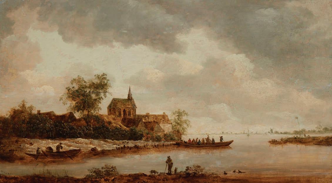 Visual: Dirt, specks of grime, slight darkening, and minor varnish discoloration, all commensurate with age. Craquelure throughout, primarily showing in the sky. A pinhead-sized puncture in the upper edge, at center.