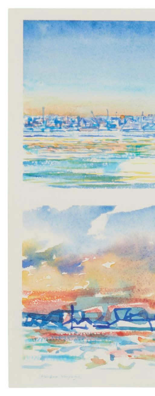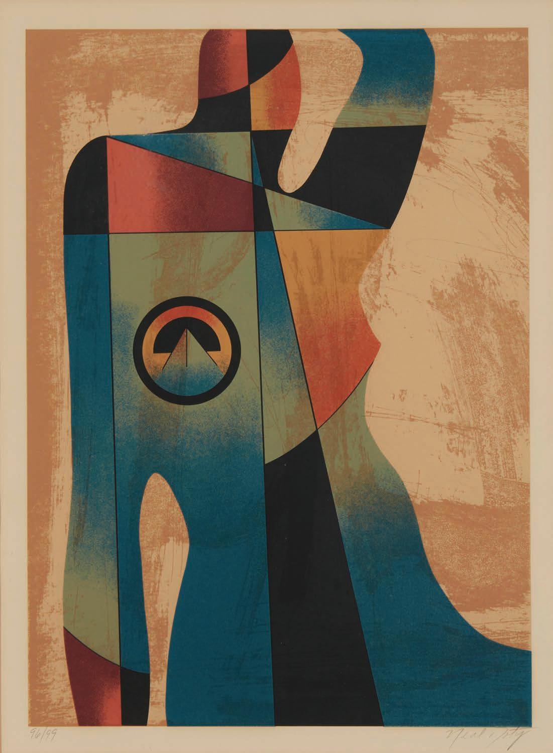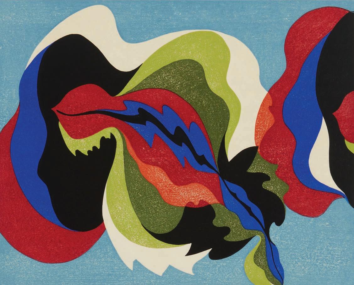 “Flying Colors,” 1974 colors on wove paper, without watermark of 250 and date printed in the stone at lower right: CA; published by State Street, New York Airlines; with the Flying Colors Collection 1975 blindstamp in the lower right corner and to the left of the artist’s initials and date on the plate with the image of the 20” H x 26” W (or opposite)