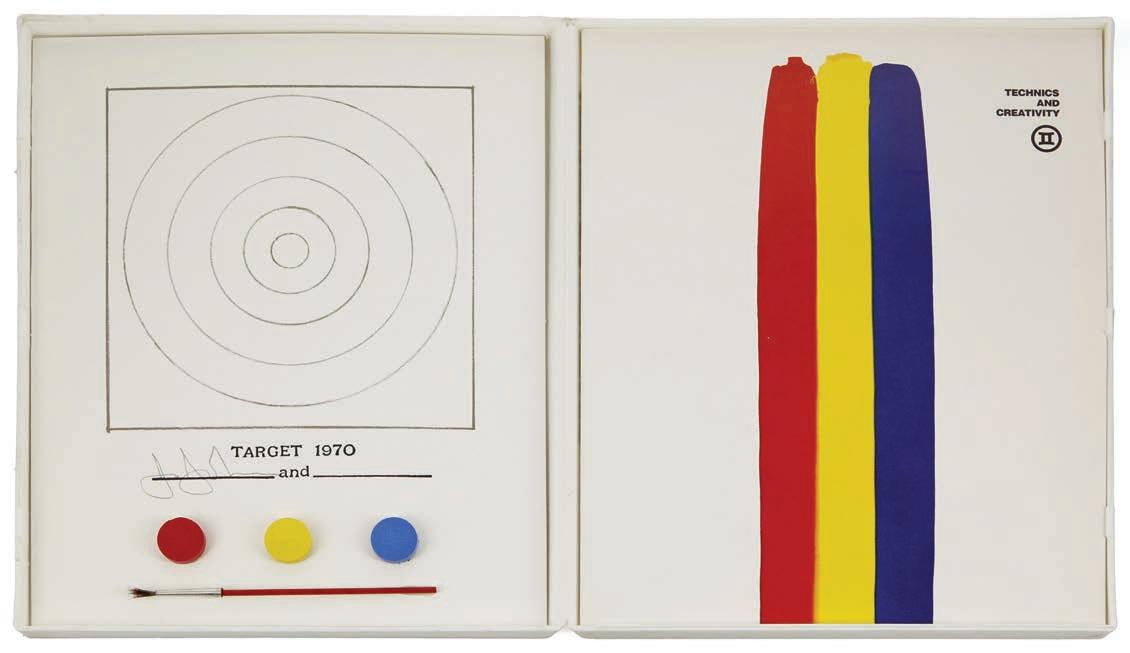 The offset lithograph, “Target 1970,” with the collaged elements and the artist’s printed signature in the image; Gemini G.E.L., Los Angeles, prntr.; The Museum of Modern Art, New York, publisher, for the sametitled exhibition; in addition to the print with its collaged elements, the 108 page soft-bound book, and the original white plastic clamshell case, this multiple also includes the original information sheet and foam rubber protective insert