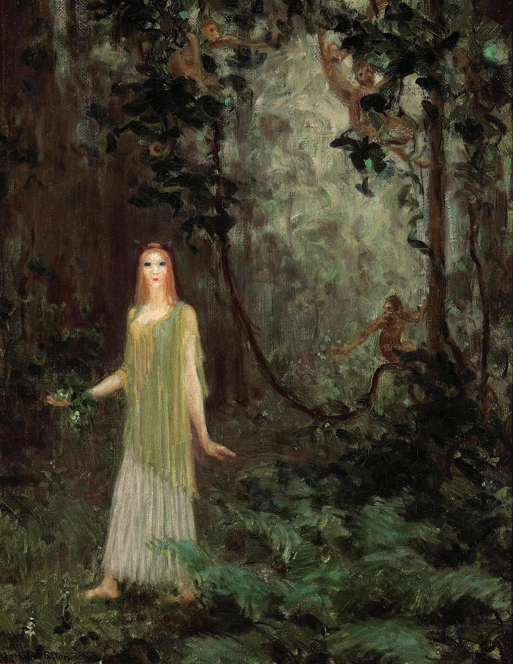 While as a general rule Pelton did not create pictures in series—her numerous Star Icon variants being a notable exception—there are occasional instances of overlap with some compositions sharing common traits. This is the case with Sleep and Wells of Jade (1931), which could have been painted side-by-side using the same color palette.