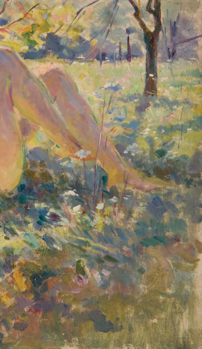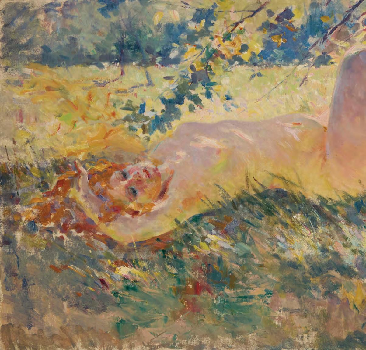 Reclining nude in dappled sun Oil on canvas Unsigned 15” H x 24” W