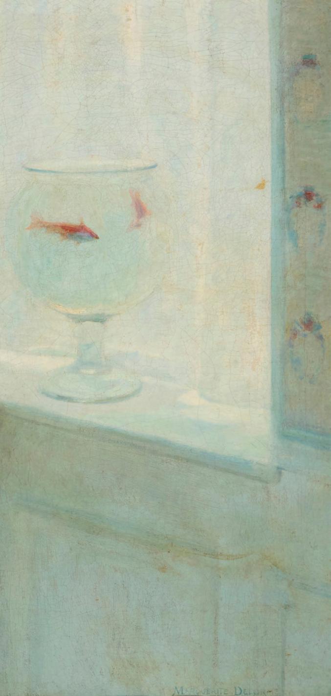 Signed lower right: Marguerite Delorme; alternatively titled on the frame plaque “The Goldfish Bowl;” titled again and with the artist’s address on the stretcher bar 32” H x 42.75” W