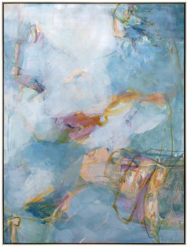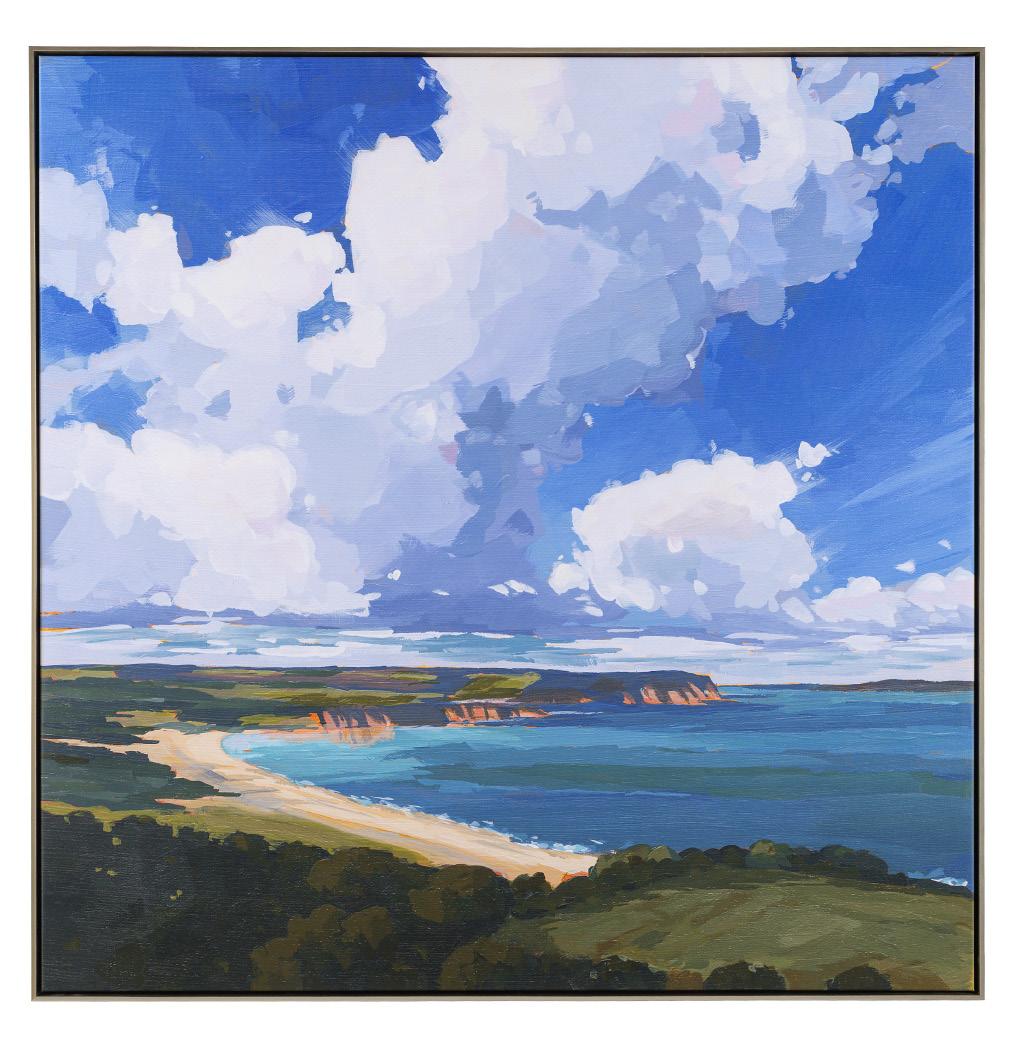 Sarah Thomas’ Coastal Keepsake, Small (GBG-3273): This luminous coastal landscape is painted in cobalt, teal, and terracotta tones. A towering sky of sun-washed clouds reflects in the bay below. Presented as a canvas giclée, the work is finished in a Champagne Gold floater frame –42" x 42" Small / 58" x 58" Large.