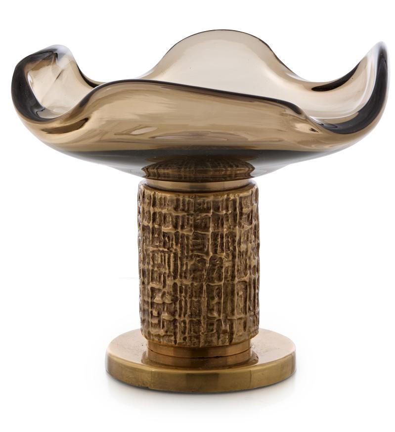 Altis Bowl, Tall (JRA-16463): This hand-blown smoke glass vessel features organic rippling curves. The airy bowl rests on an Antique Brass pedestal with a pitted, grid-like texture – 7.5" H x 9" W x 9" D.