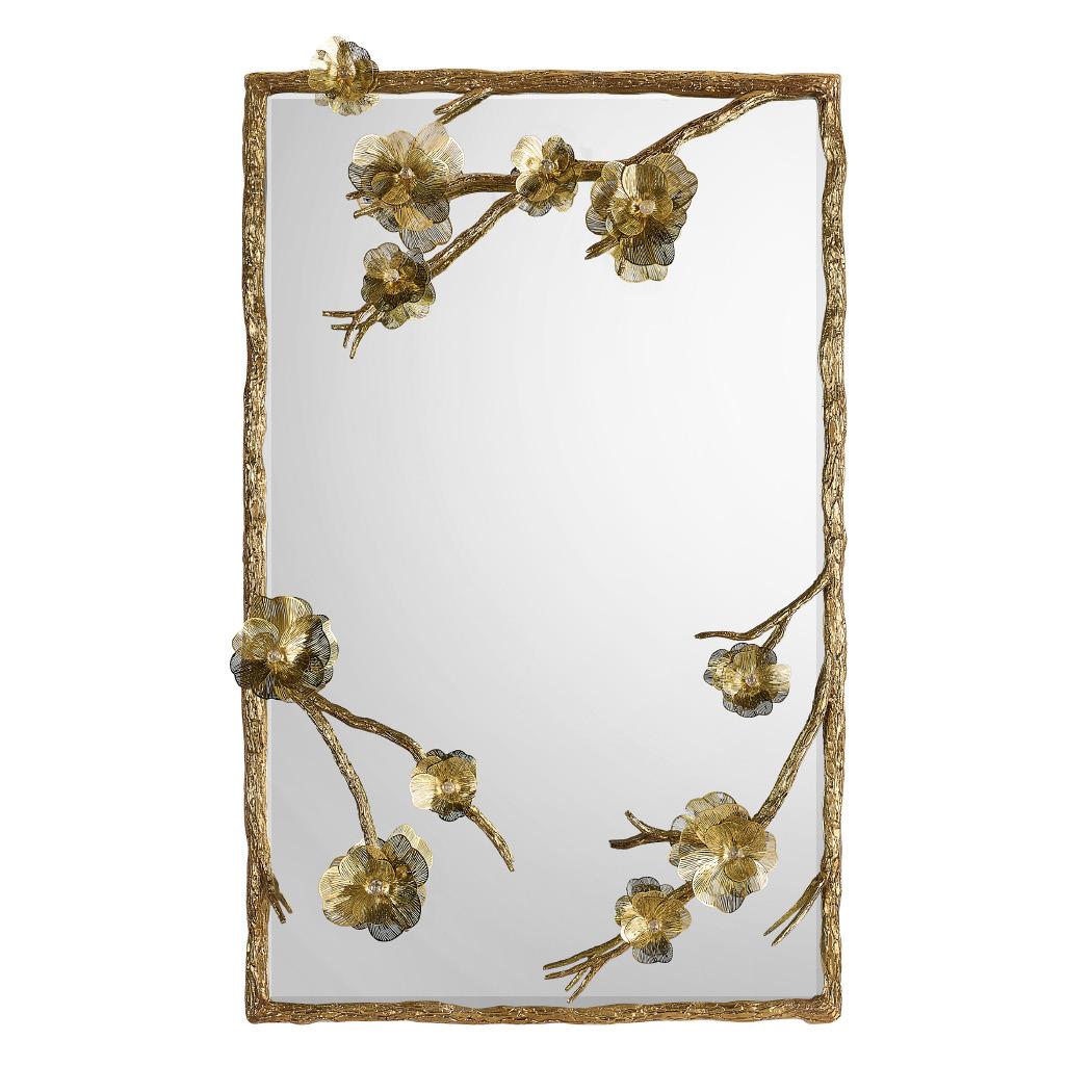 Camellia Mirror (JRM-1631): This sculptural mirror features branching brass petals in a Honey Brass finish. Each blossom is embellished with a hand-blown glass orb – 34" W x 54" H x 6" D.
