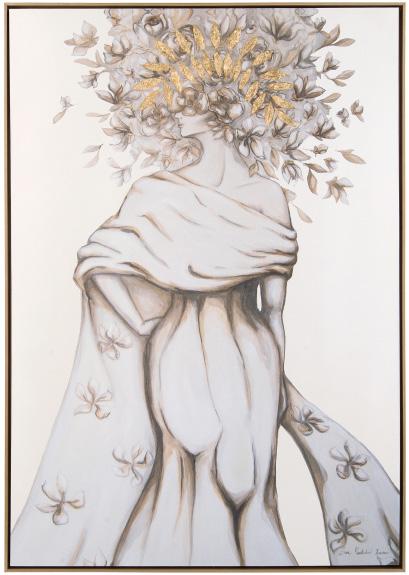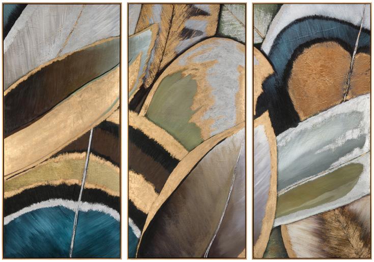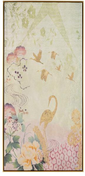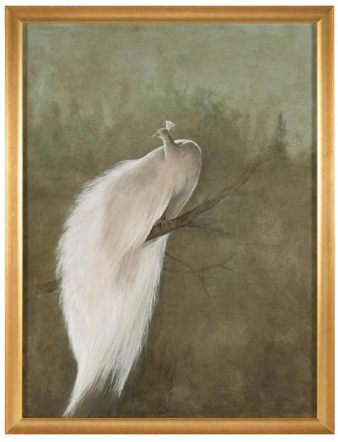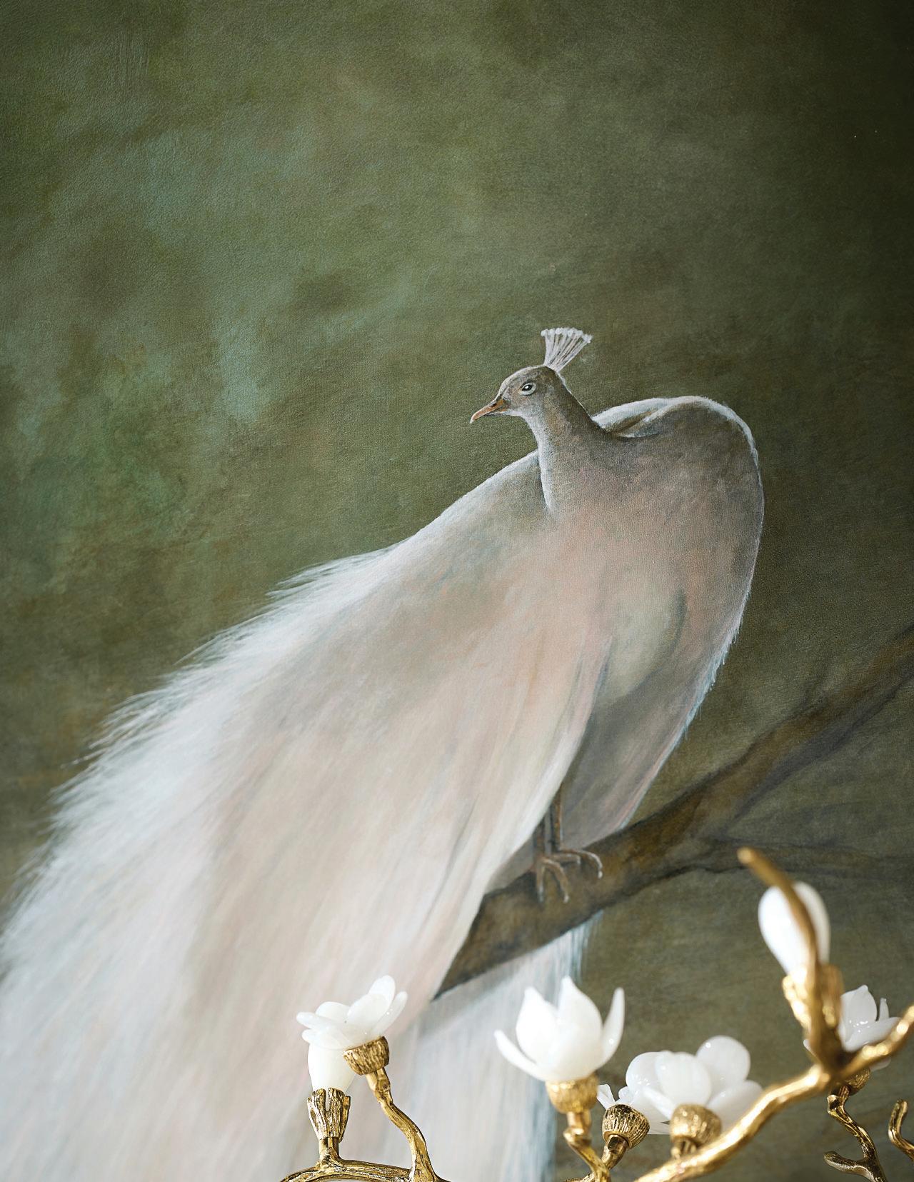 From frame to finish, John-Richard wall art is crafted entirely in-house by skilled Greenwood artisans. Feathers by Shaye Rawson exemplifies the studio’s highquality giclée printing, rendered on canvas with textures that capture the nuance of Rawson’s original brushstrokes. Handapplied gold and silver leaf highlights bring subtle radiance to the design, while a gentle gloss medium seals the metallic leaf and enriches the depth of color. These prints extend beyond canvas to mediums such as silk and watercolor paper, as seen in Belle Poesia’s Contemplation and Zana Brown’s Golden Gardenia. Both works feature similar gilding techniques, where wildlife and lush flora are accented with shimmering metallic tones. The result is a collection that merges classic natural motifs with modern sophistication, each piece reflecting the precision and patience of the skilled hands that bring it to life.
