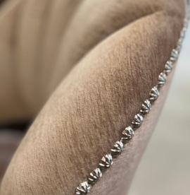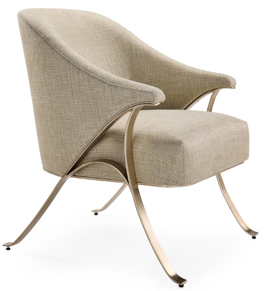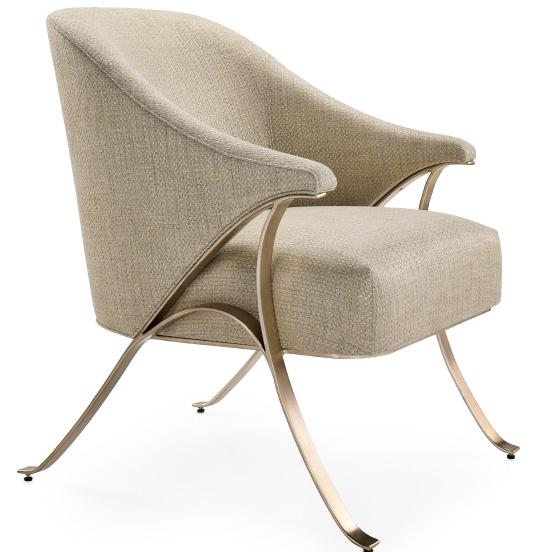 Slope Accent Chair - 2228 (AMF-1818V391-2228) : The Slope Accent Chair presents a transitional silhouette defined by continuous curvature. Slender steel legs in White Brass sweep from beneath the armrests, creating an airy profile. The chair is upholstered in Precious Metal Golden 2228 fabric, coordinating seamlessly with the metallic base – 34" H x 31.5" W x 27" D.