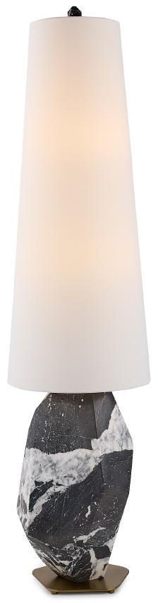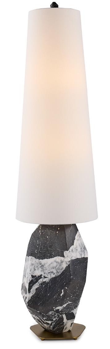 Lithos Floor Lamp (JRL-11399): The Lithos Floor Lamp features a bold body cut from dramatically veined Calacatta black marble. It anchors to a sleek Antique Brass pedestal with matching hardware. The piece is topped by a white linen shade and a faceted marble finial – 64" H x 16" W x 16" D.