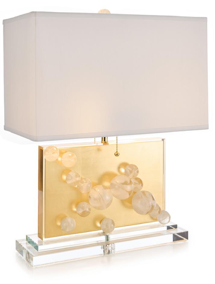 Levante Table Lamp (JRL-11296): The Levante Table Lamp presents a geometric core hand-gilded in gold leaf and encased in clear composite with floating, misty-streaked acrylic orbs. The piece rests atop a two-tier acrylic base and topped by a white linen box shade and matching acrylic ball finial –24" H x 18" W x 10" D