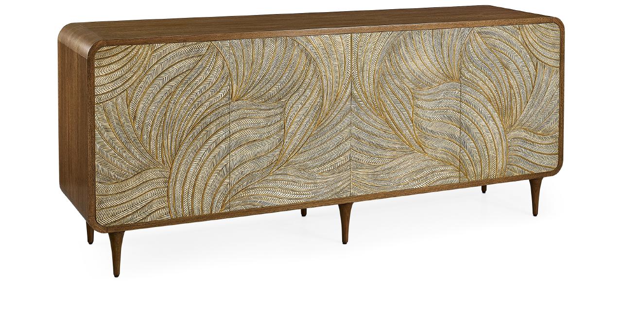 Halcyon Four-Door Credenza (EUR-04-1001): The Halcyon Credenza displays figured eucalyptus veneer in a Monteverde finish. Sweeping, hand-carved composite flourishes are accented with gold leaf to create an organic sense of motion – 36" H x 86.5" W x 20" D.
