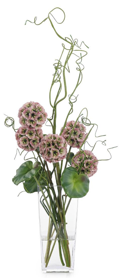 Willow and Purple Scabiosa (JRB-5701W): This vertical display pairs winding willow branches with spherical purple scabiosa and lily pad leaves. Stems are secured in a clear rectangular glass vase with permanent faux water – 39" H x 15" W x 12" D.