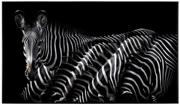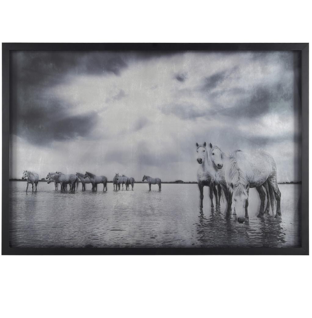 Rodney Bursiel’s Sundowner (GBG-3249): Sundowner by photographer Rodney Bursiel captures a herd of Camargue horses amidst shallow floodwaters and a brooding sky. This black and white photograph utilizes silver leafing to create an otherworldly luminescence, resulting in a composition that is both monumental and quietly electric – 62.37" W x 42.37" H x 2" D.