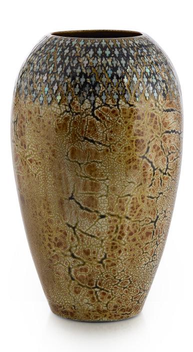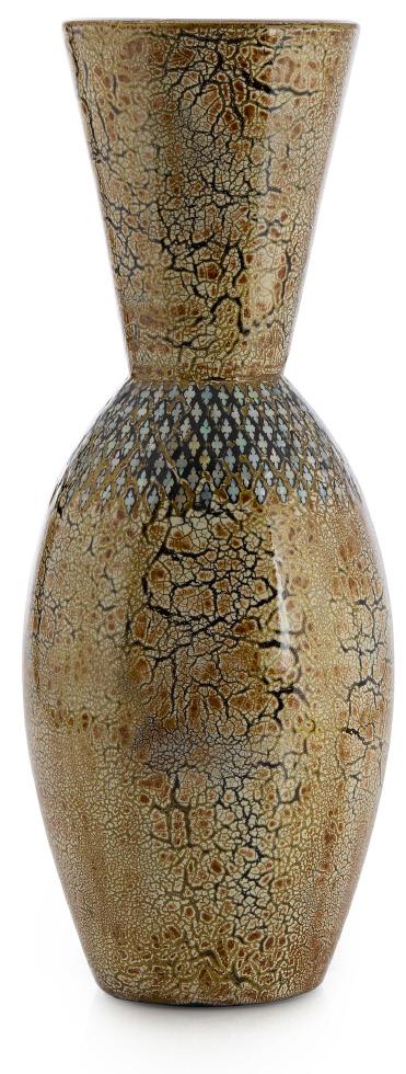 Sonoran Vase, Large (JRA-15950), Sonoran Vase, Small (JRA-15951): This tapered ceramic vessel features a white crackle glaze over a warm brown finish. A rim of inlaid mother-of-pearl in a geometric pattern adds a luminous contrast to the rustic ceramic body – 27" H x 7" W x 7" D Large / 15" H x 9" W x 9" D Small.