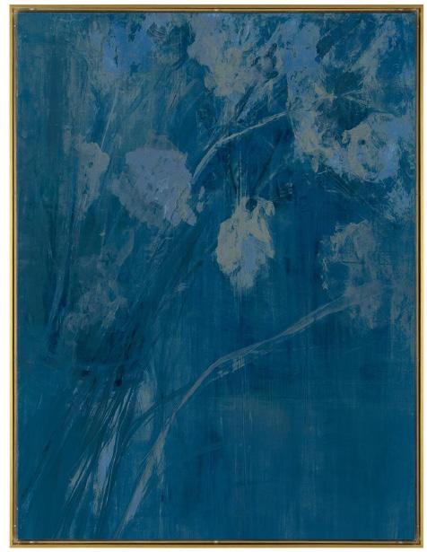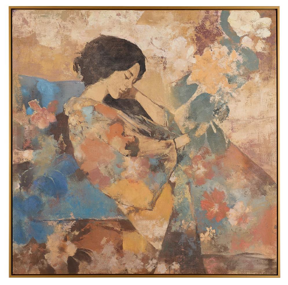 Teng Fei’s Bed of Flowers (JRO-3662): This impressionistic oil painting features a contemplative figure amidst lush florals. A warm palette of apricot and ochre contrasts with deep cerulean and slate blues. The composition is displayed in a gold wood frame – 60" W x 60" H x 1.5" D.