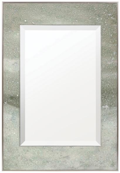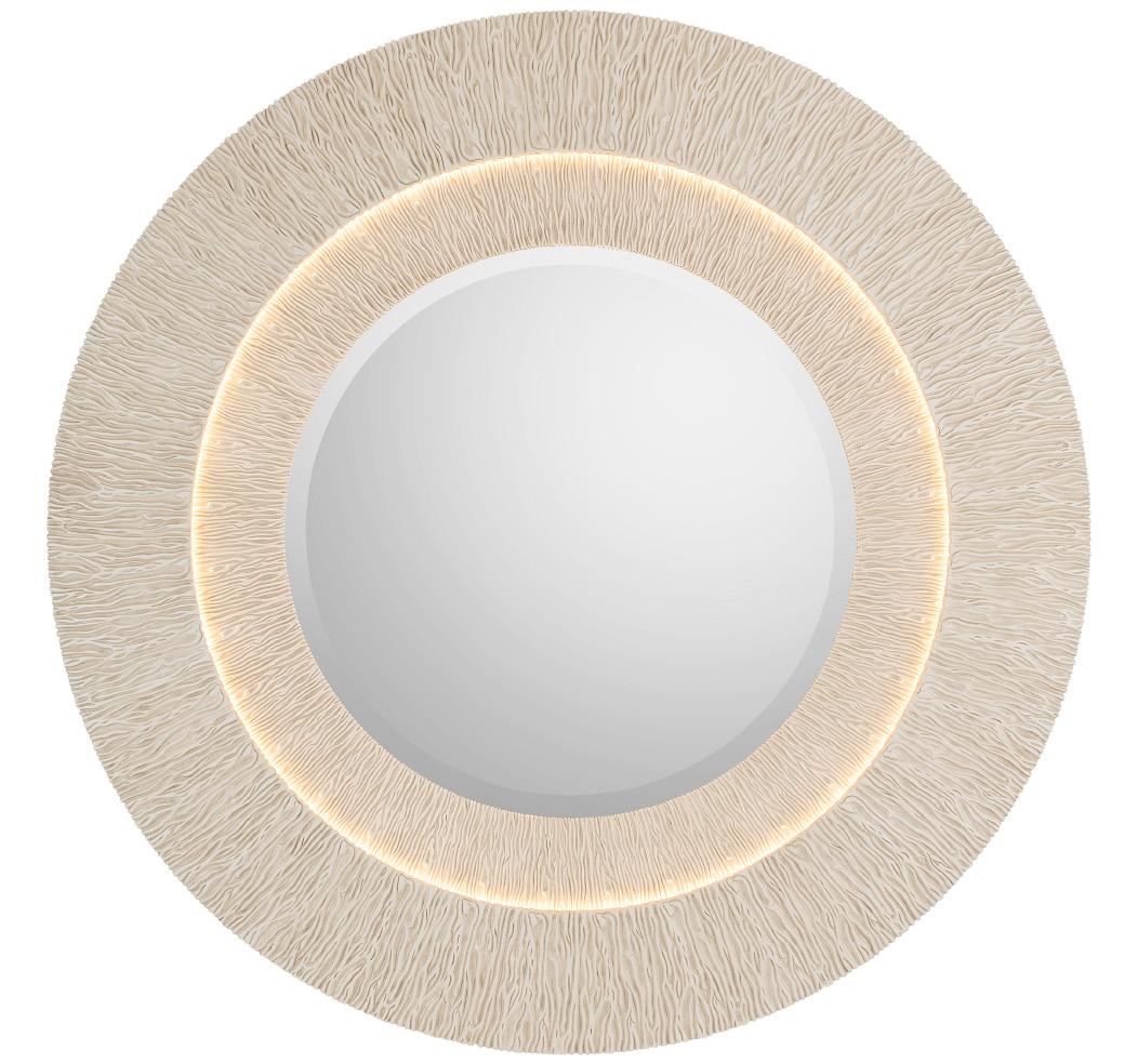 Contorno Lighted Mirror (JRM-1503): The Contorno Mirror features a tactile Antique Beluga frame with rippling textures. An integrated LED strip illuminates the beveled glass and interior ridges –58" W x 58" H x 3" D.