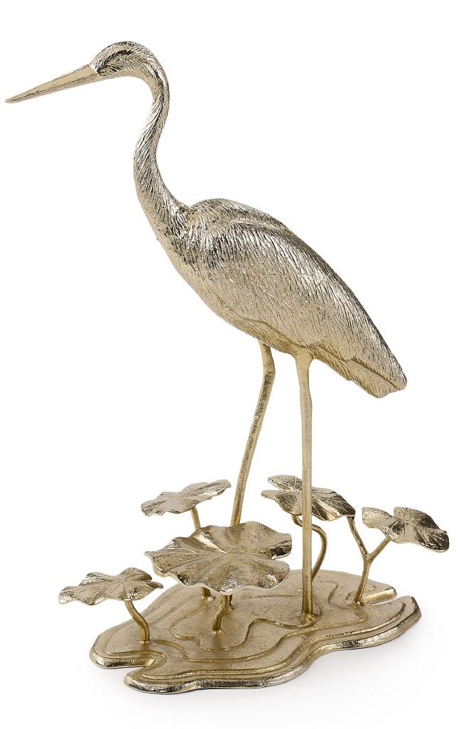 Wading Heron Sculpture (JRA-16444): Crafted from aluminum in Light Champagne, this sculpture depicts a heron in meticulous detail. The figure stands atop textural foliage anchored by a rippled watereffect base – 35" H x 29" W x 17.5" D.