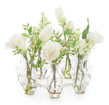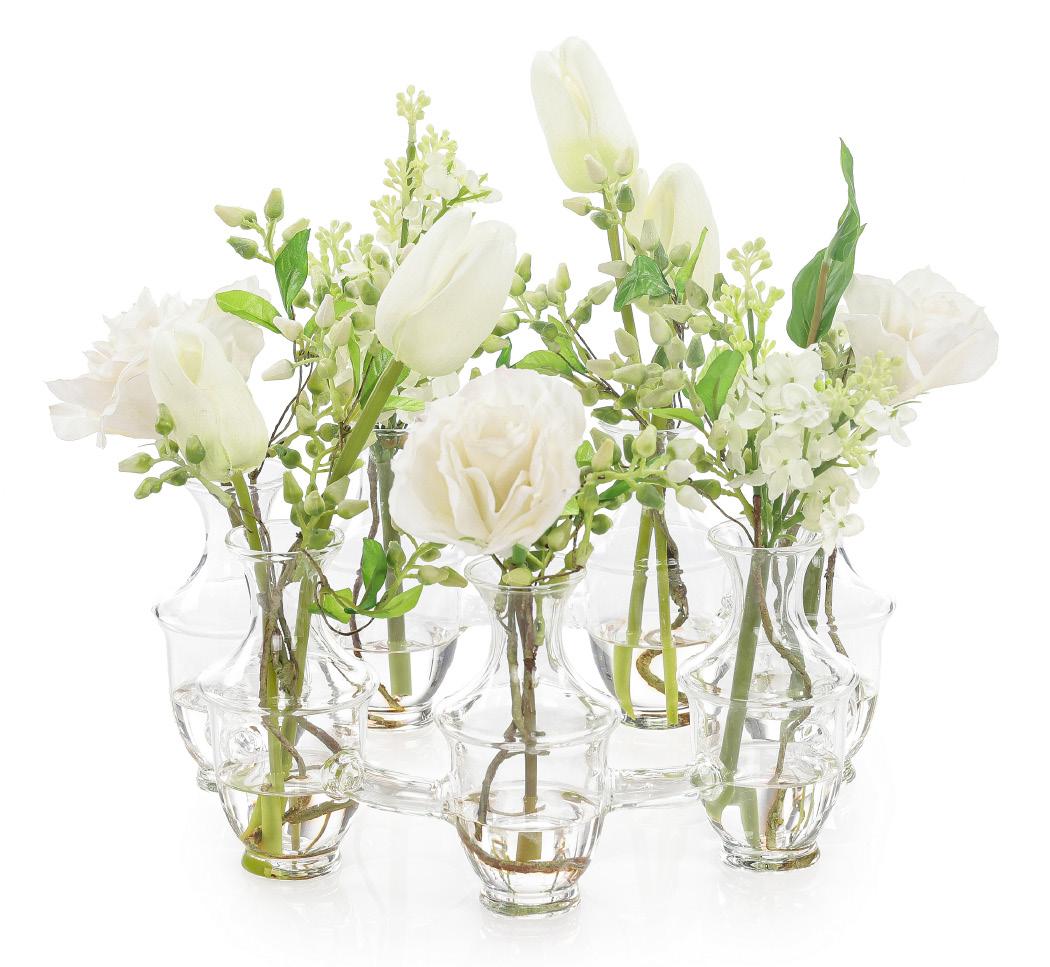 Flower Garden Halo (JRB-5712W): A lush mix of white tulips, hydrangeas, and lisianthus is accented by textural berry sprays. The arrangement is set within a unique halo of connected clear glass vases with faux water – 10.5" H x 15" W x 15" D.