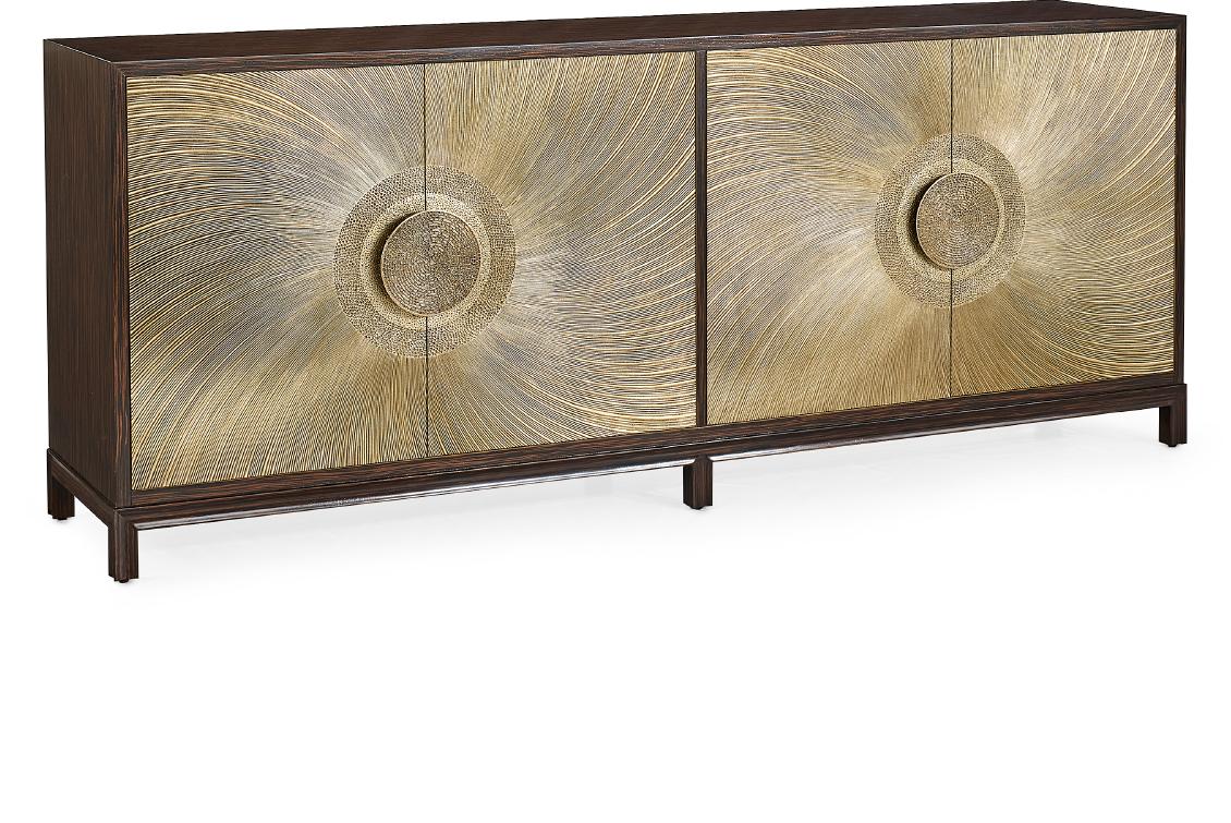 Gale Four-Door Credenza (EUR-04-1007): The Gale Credenza displays a Macassa quarter veneer frame in a Merida Ebony finish. Hand-carved Valyrian Gold detailing showcases a stylish radial pattern, punctuated by hammered aluminum handles – 36" H x 90.5" W x 20" D.