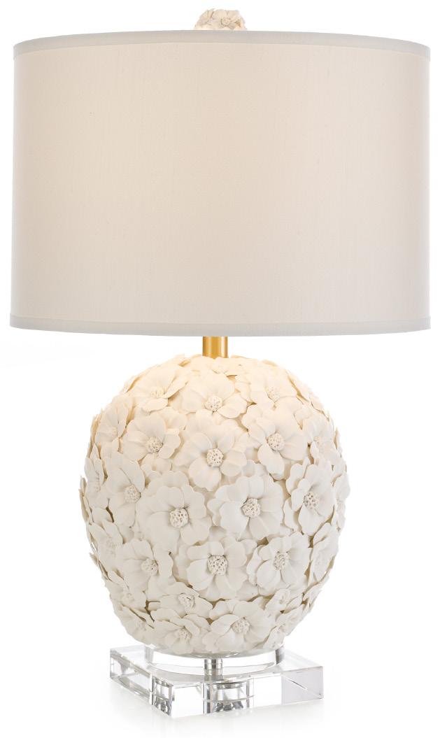 Topiary Table Lamp (JRL-11403): The Topiary Table Lamp displays a spherical white porcelain body enveloped in detailed, hand-sculpted florals. It is anchored by a two-tier crystal base and finished with a white linen drum shade and coordinating porcelain flower finial – 25" H x 15" W x 15" D.