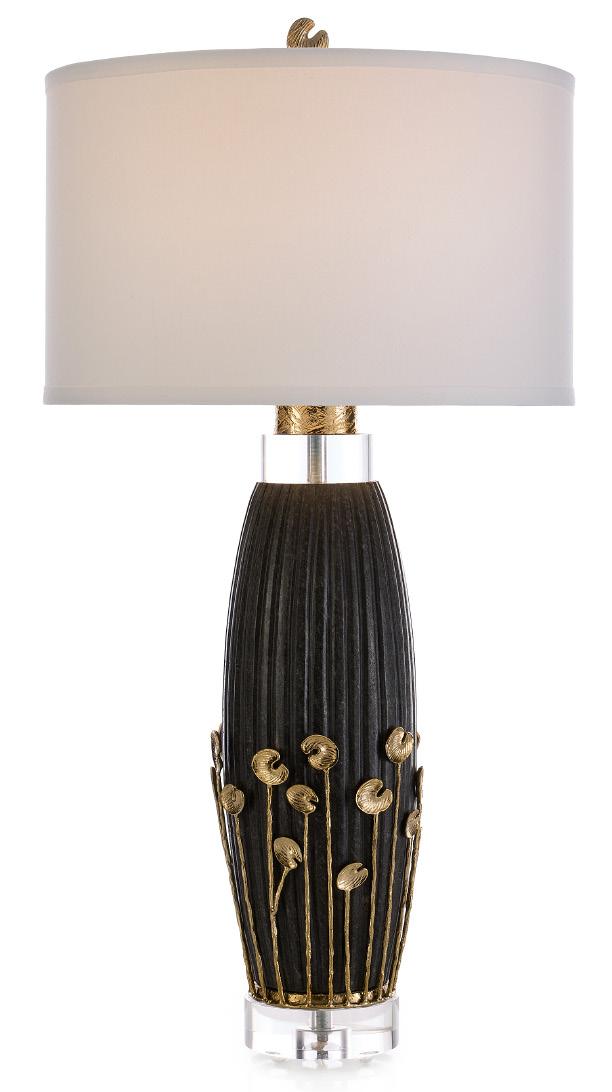 Twilight Garden Table Lamp (JRL-14466): TThe Twilight Garden Table Lamp showcases a textural, pencil-cut black marble body embellished with brass florals in Champagne tones. Bookended by clear acrylic accents at the base and neck, the piece features a white linen drum shade with an organic brass finial that mimics the floral motifs below – 32” H x 16” W x 16" D.